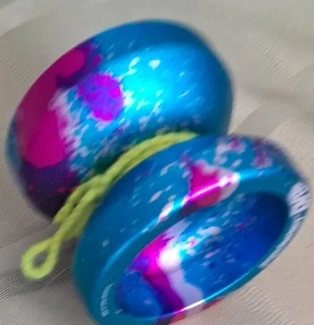 A bright blue yo-yo with pink and purple splatter accents. It's ready for some classic yo-yo tricks. This yo-yo is great for practicing new moves!