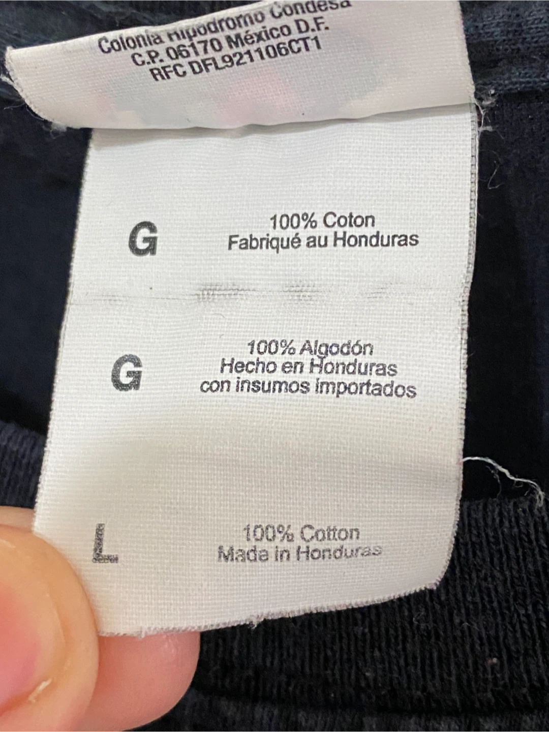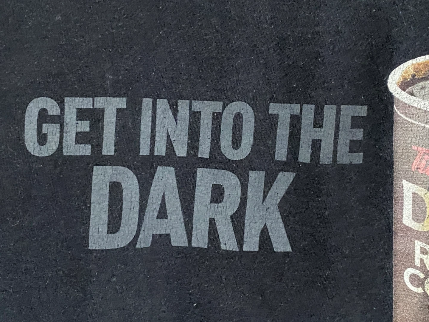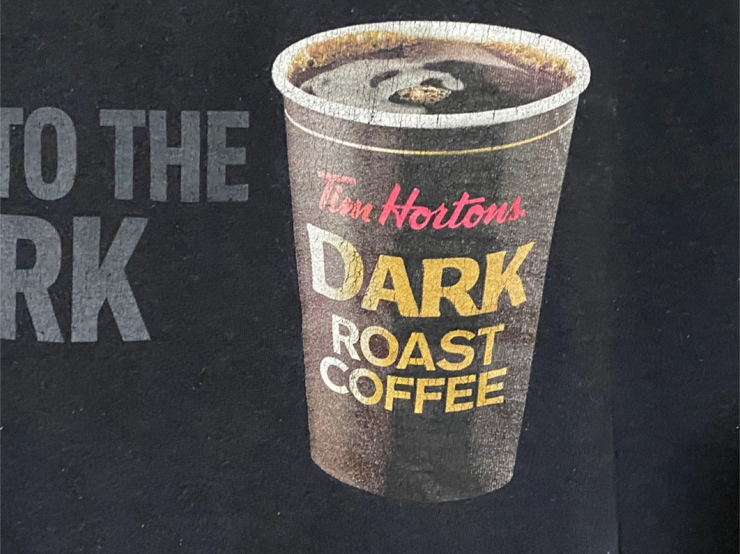 This black t-shirt features the Tim Hortons 'Dark Roast Coffee' graphic with the text 'GET INTO THE DARK'. It's made of 100% cotton. Size L. Graphic has some wear.