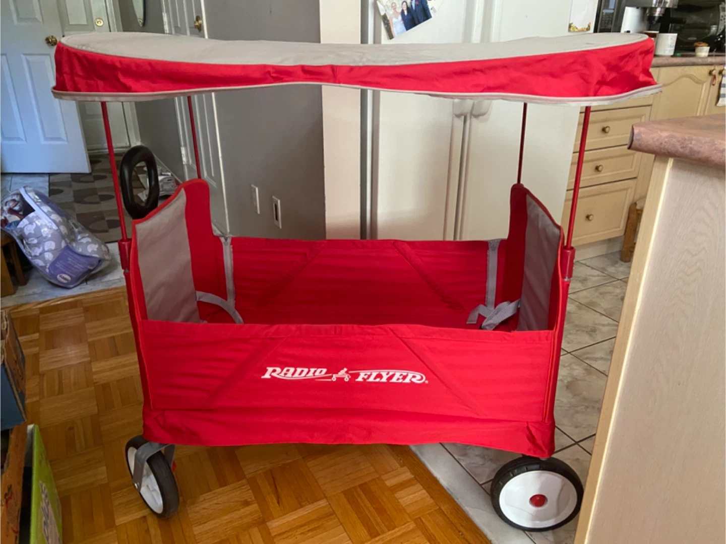 Selling a Radio Flyer convertible stroller wagon in super great condition! This wagon is perfect for hauling kids and cargo, and the convertible design makes it easy to switch between stroller and wagon modes. It's red and grey. Solid wheels, easy Swivel front wheels and sturdy pull handle.