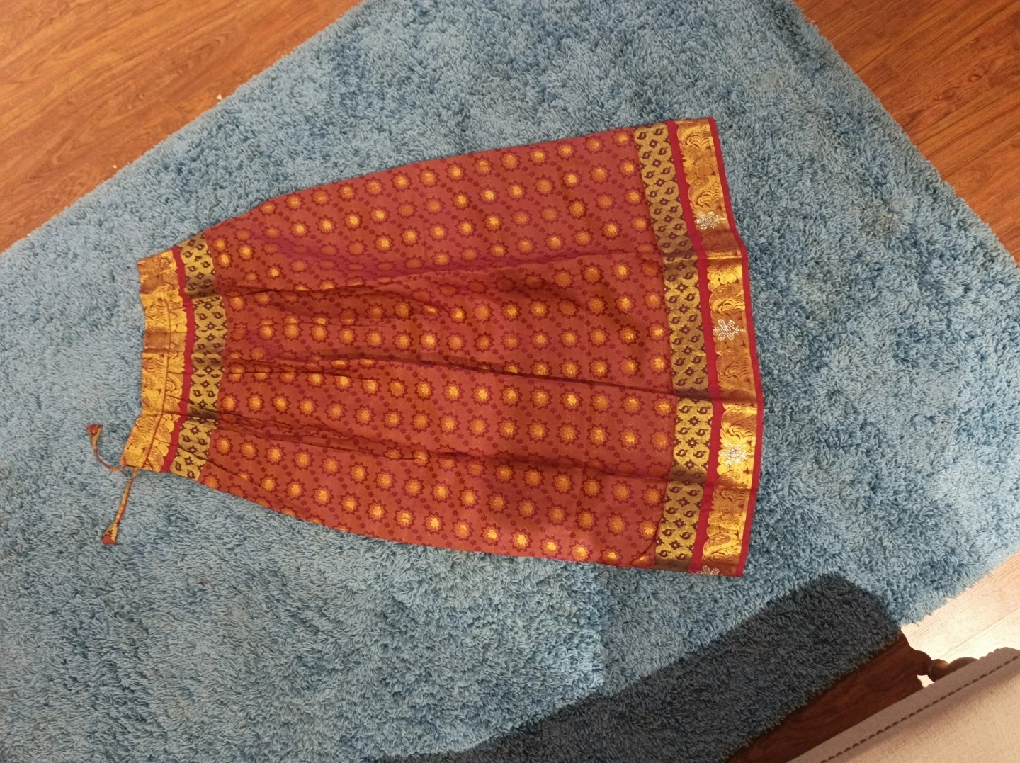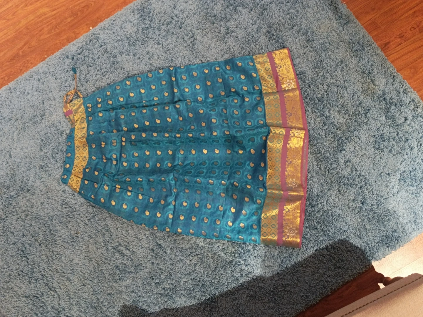 Beautiful teal and maroon ethnic skirts. These pavada are made from a silky fabric with gold intricate patterns. They feature a drawstring waist for a comfortable fit.