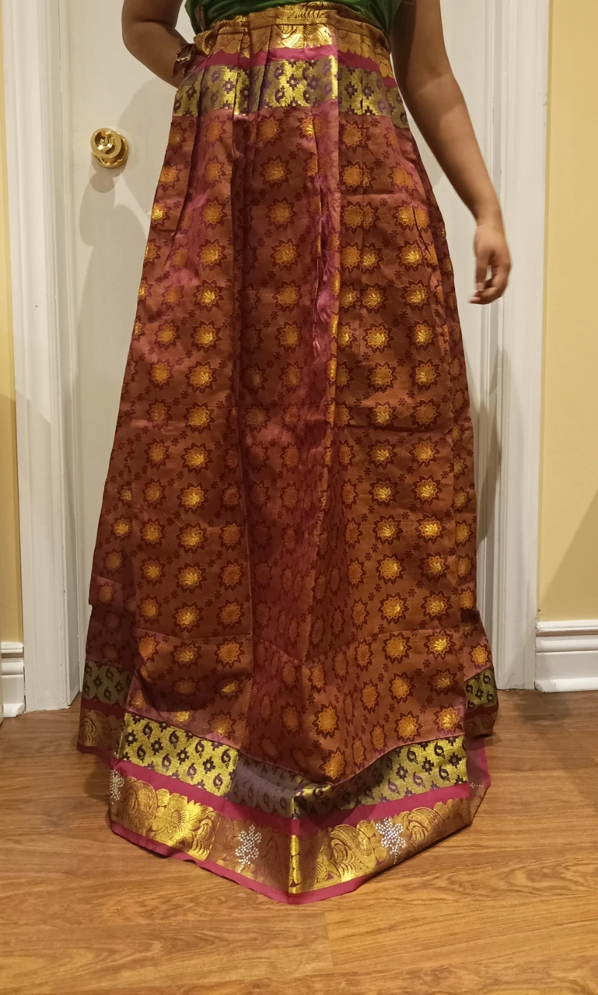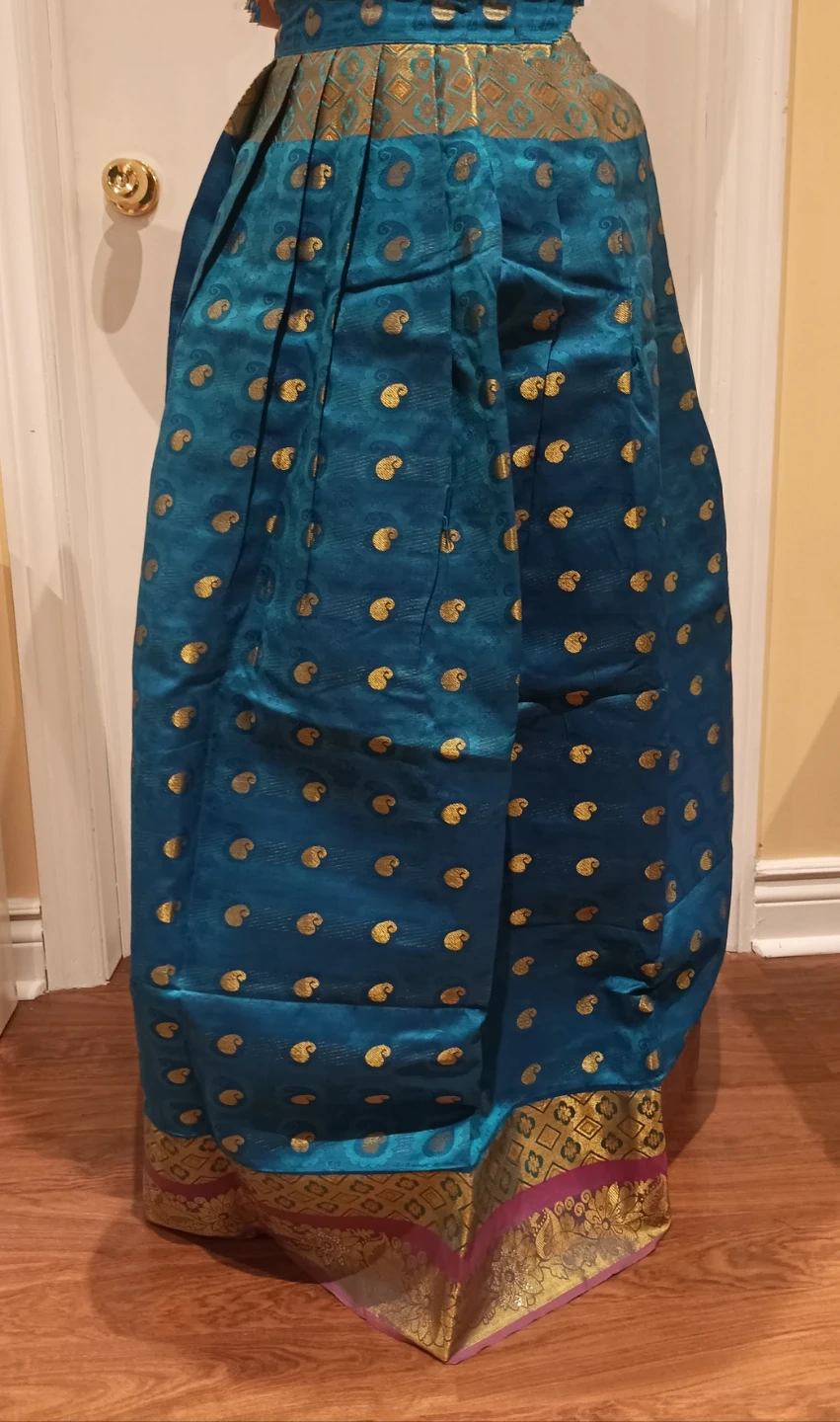 Beautiful teal and maroon ethnic skirts. These pavada are made from a silky fabric with gold intricate patterns. They feature a drawstring waist for a comfortable fit.