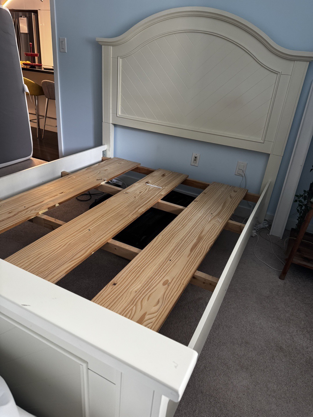 This is a cream coloured bed frame with a decorative headboard. It's made of wood and comes with slats for mattress support. The frame is a queen size. It's ready to provide a stylish foundation for your bedroom! It’s also dismantle-able!