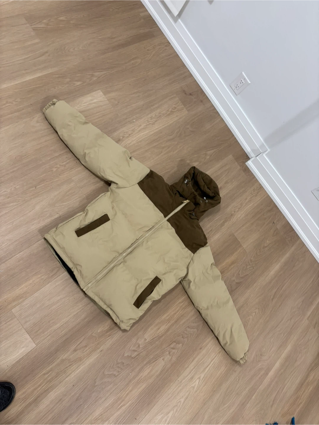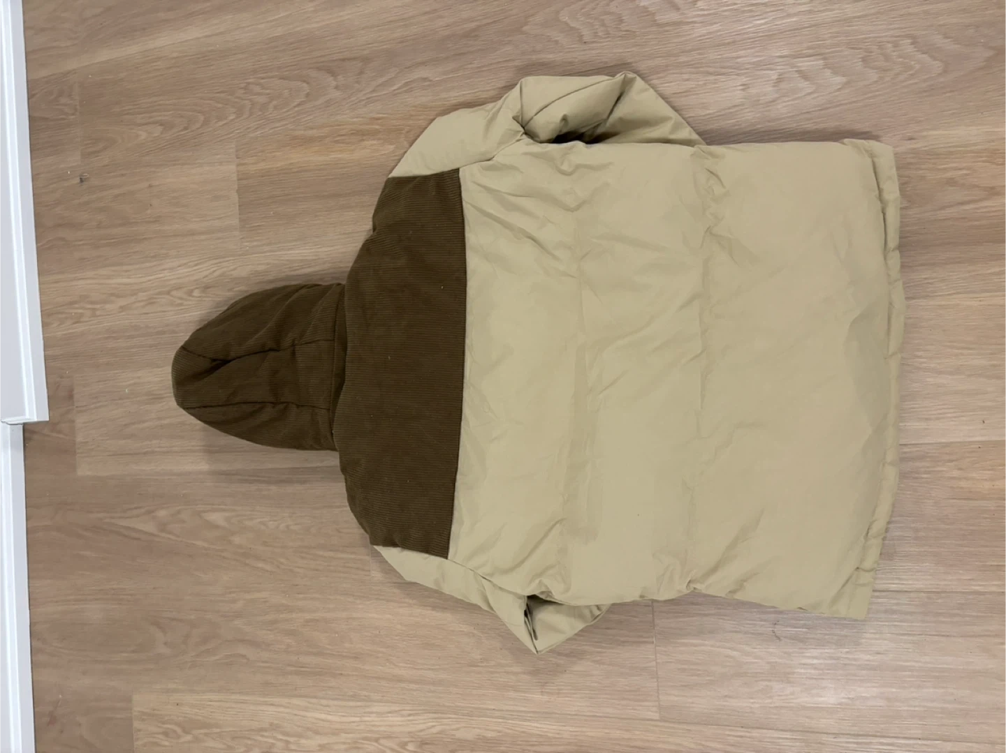 This puffer jacket is designed with a colour-block style. It features corduroy paneling on the hood and chest area. The jacket is equipped with a zipper closure.