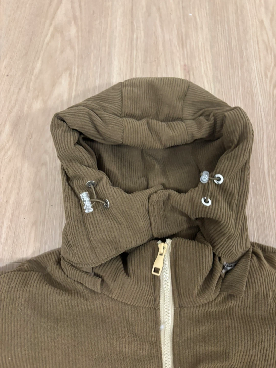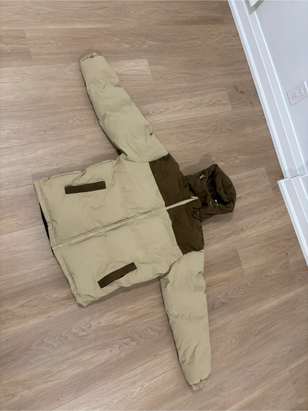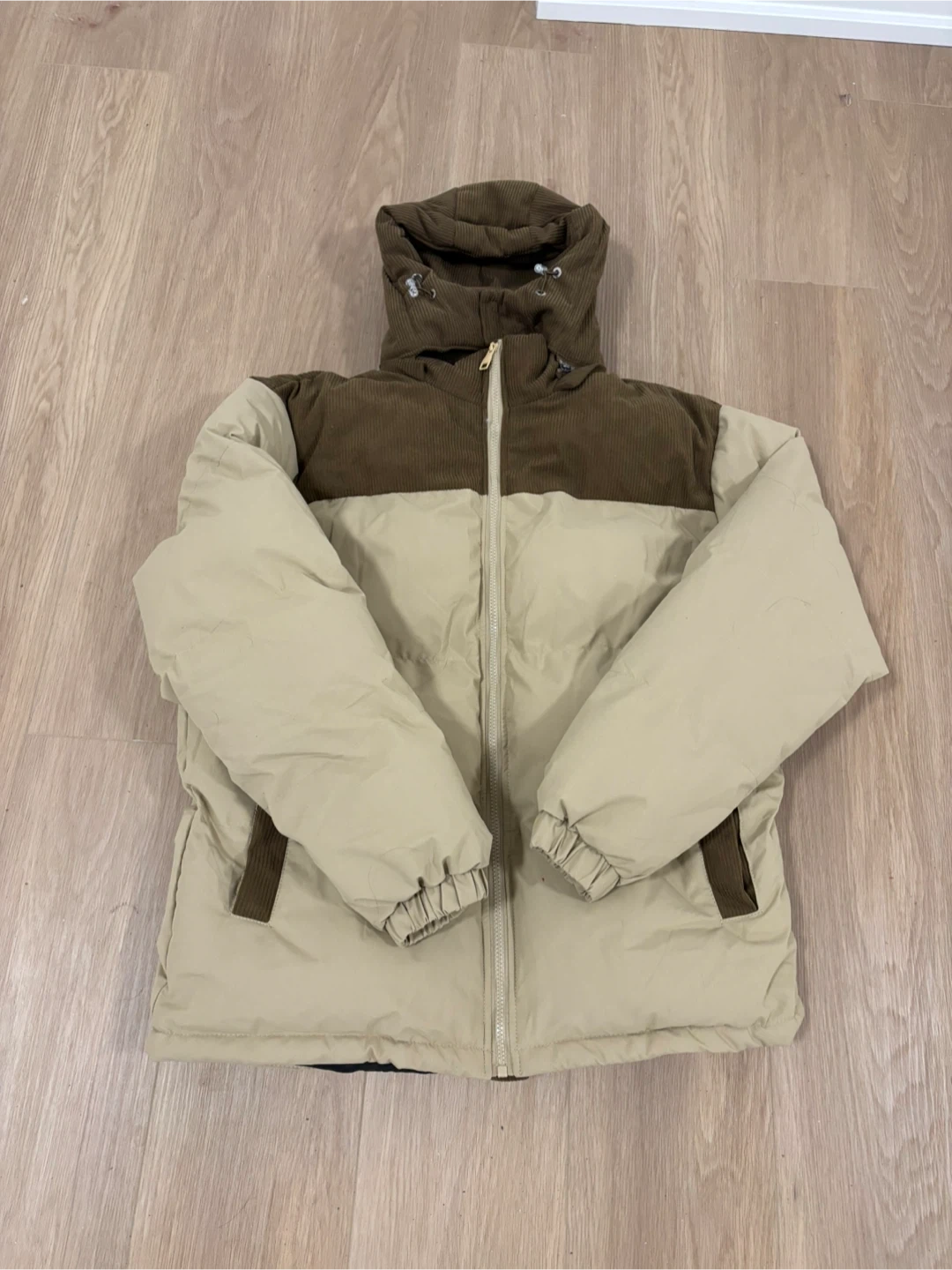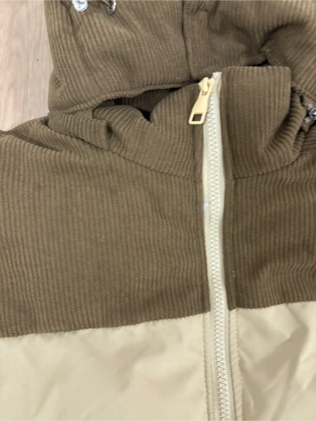 This puffer jacket is designed with a colour-block style. It features corduroy paneling on the hood and chest area. The jacket is equipped with a zipper closure.