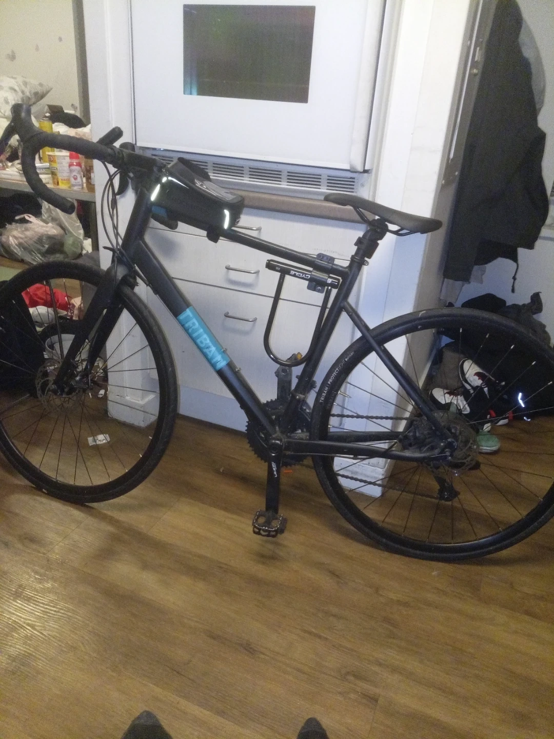 🏆🏆🏆Triban road bike for sale. It's a black frame with drop handlebars. Comes with a saddle bag and a U-lock. Disc brakes are installed.shimano sora pedals,