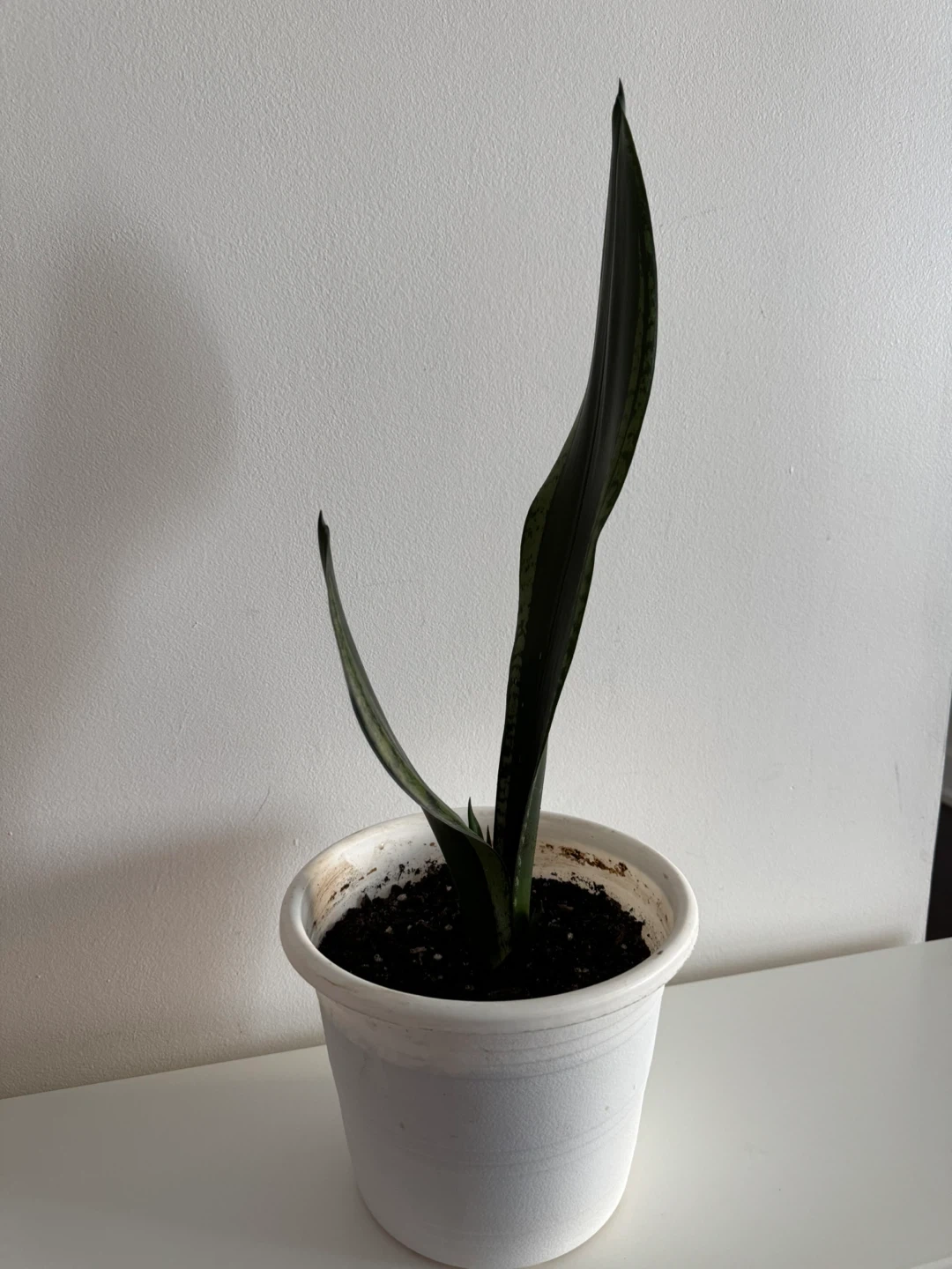 This is a snake plant potted in a simple white planter. It's a popular houseplant known for its air-purifying qualities. The plant has distinctive dark green, sword-like leaves with some lighter green variegation. It's a low-maintenance plant.