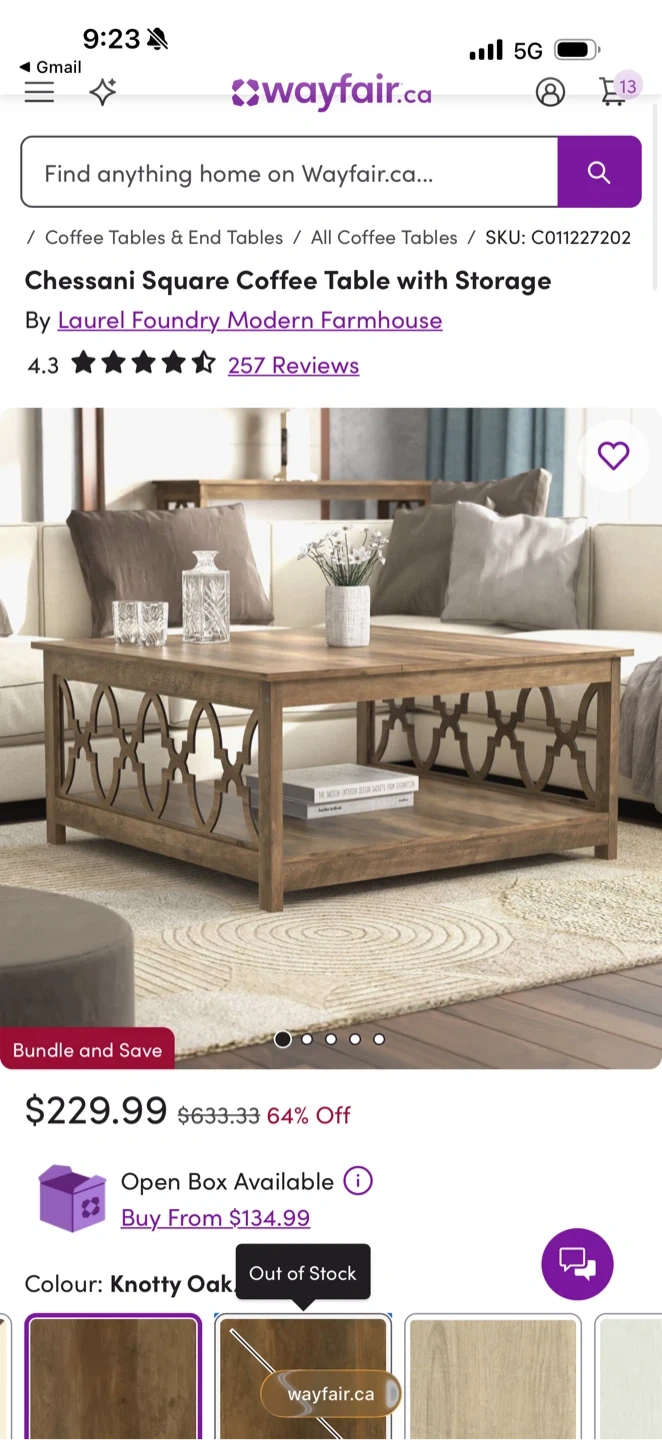 This Chessani Square Coffee Table offers convenient storage. It's constructed from wood in a Knotty Oak finish. It features a lower shelf for extra space. Brand new