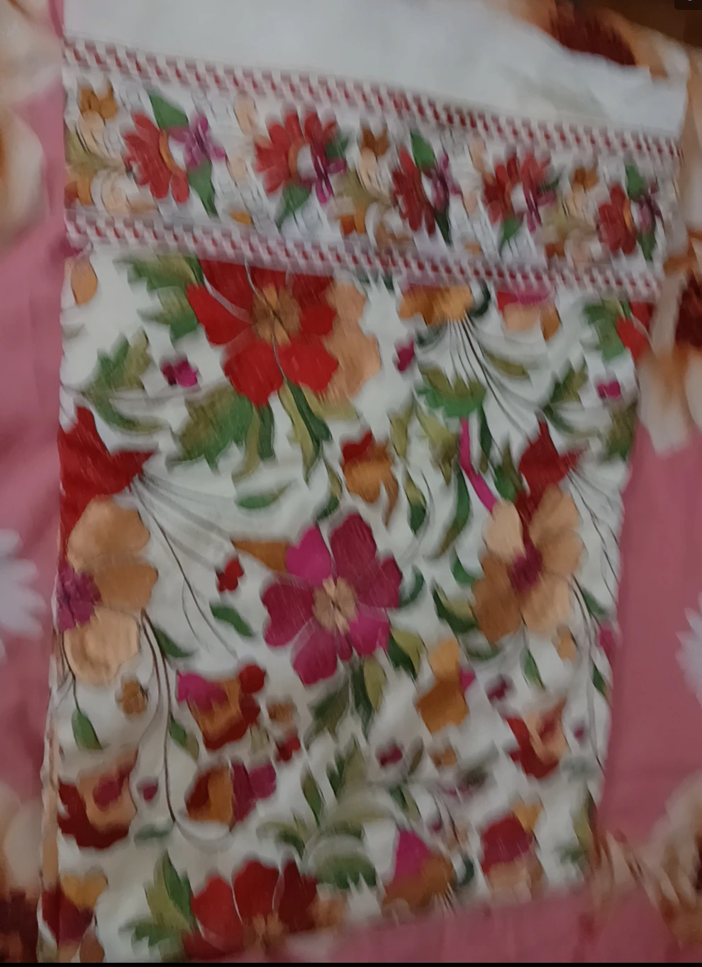 Picture is a bit blurry, sorry about that, my phones camera is not doing justice but I can show you a better picture later, It's a beautiful party saree featuring a vibrant floral design with a decorative border. Bought it for $100+ but I'll sell it around for $60. Its brand new basically, as I never tried it on before but just only bought and kept it for a while in my closet, i'm just trying to sell clothes I don't use or need so this is up for sell πβ¨οΈ The pattern includes a mix of red, pink, and orange flowers with green foliage.