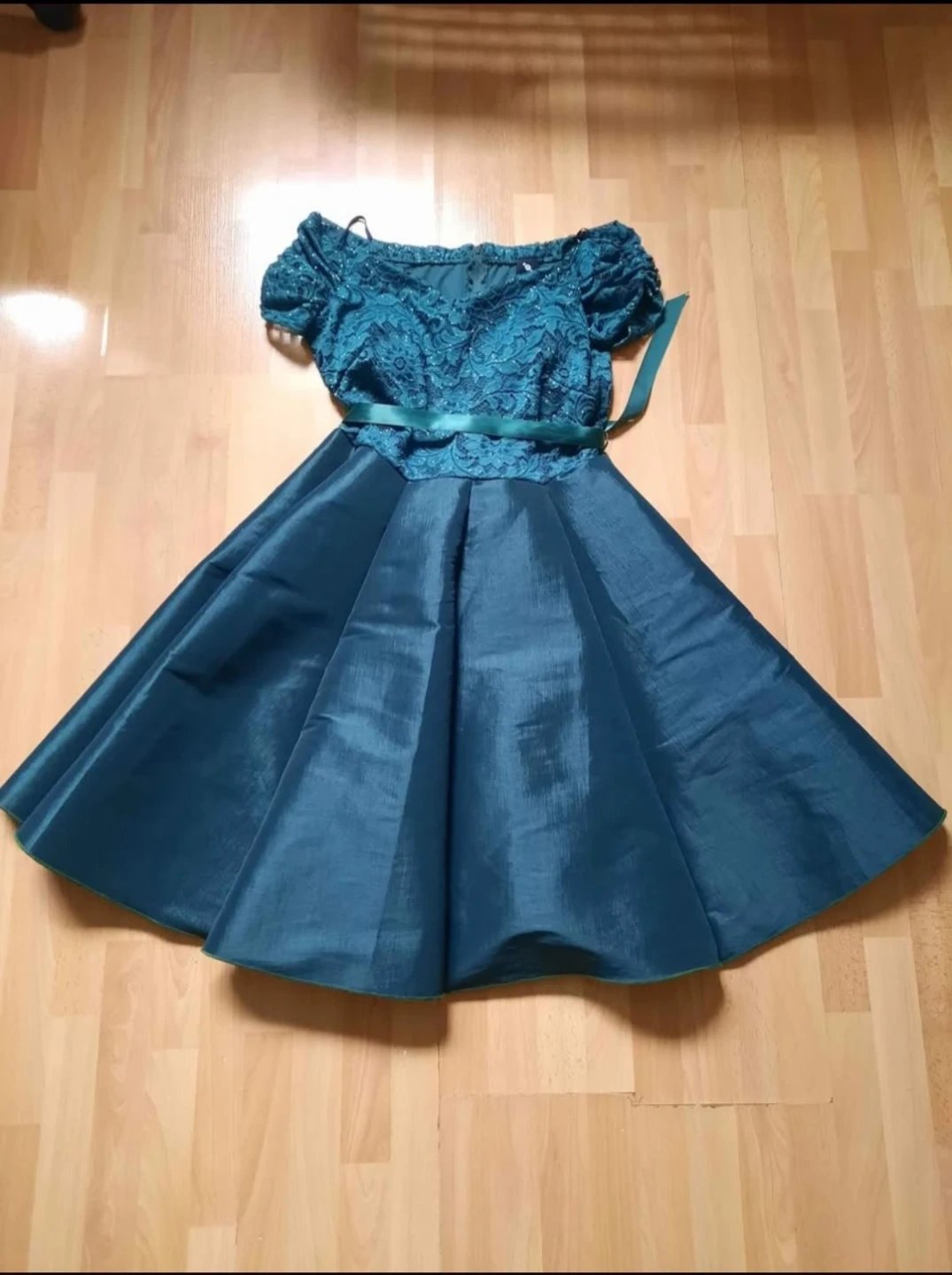 This teal dress features a lace bodice with off-the-shoulder short sleeves. It has a satin-like full skirt with a ribbon tie at the waist. Perfect for special occasions!