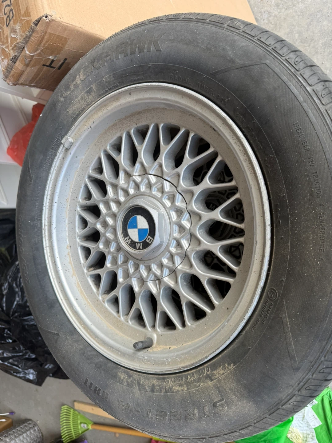 This is a BMW M-System II "Throwing Star" alloy wheel with a tire. The tire size is 215 and it's a radial tubeless model. It has a treadwear rating of 420.