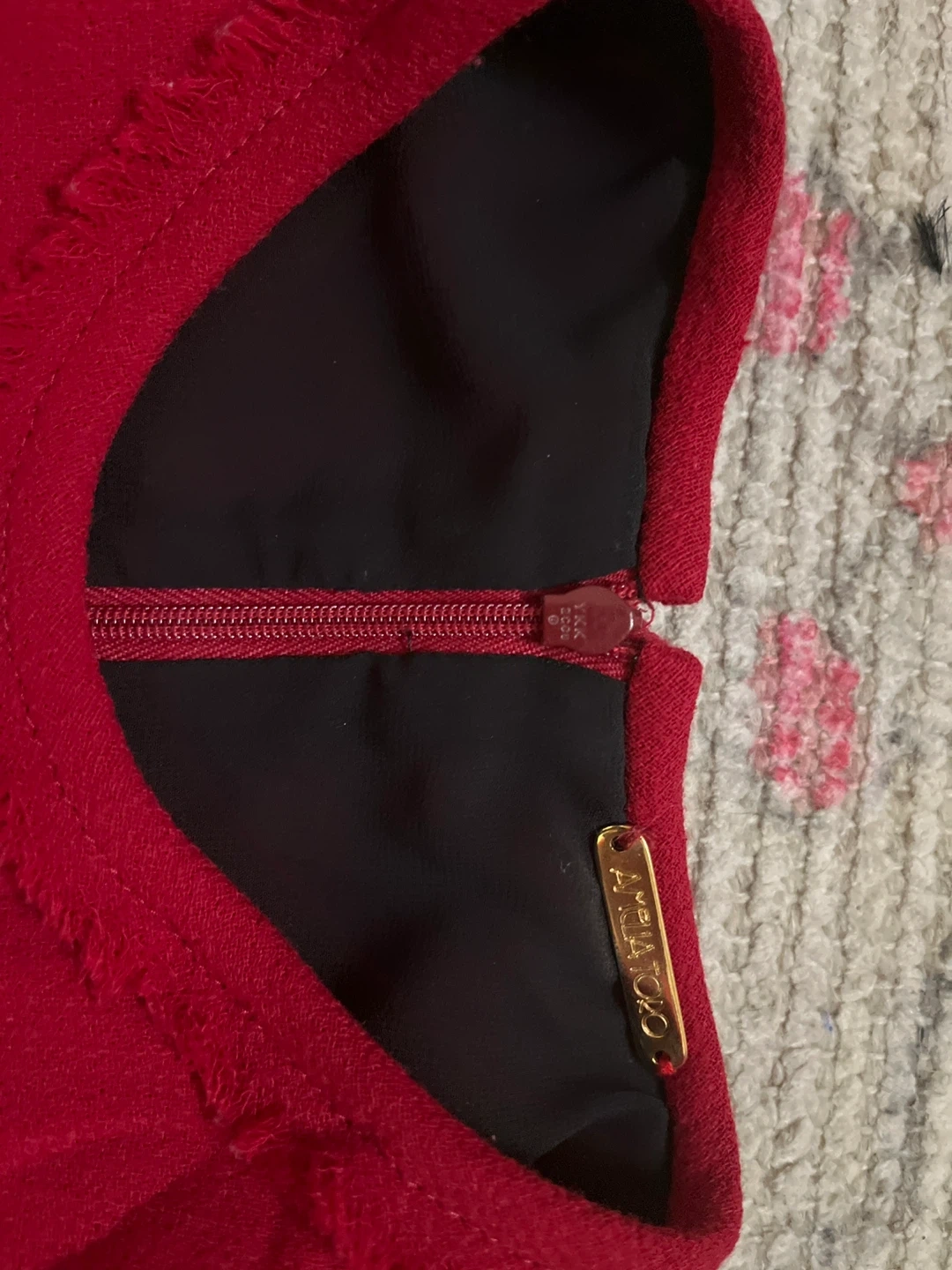 Alice + Olivia short sleeve sheath dress in red. Features a zip back closure and raw edge detailing at the neckline. Sheath silhouette.