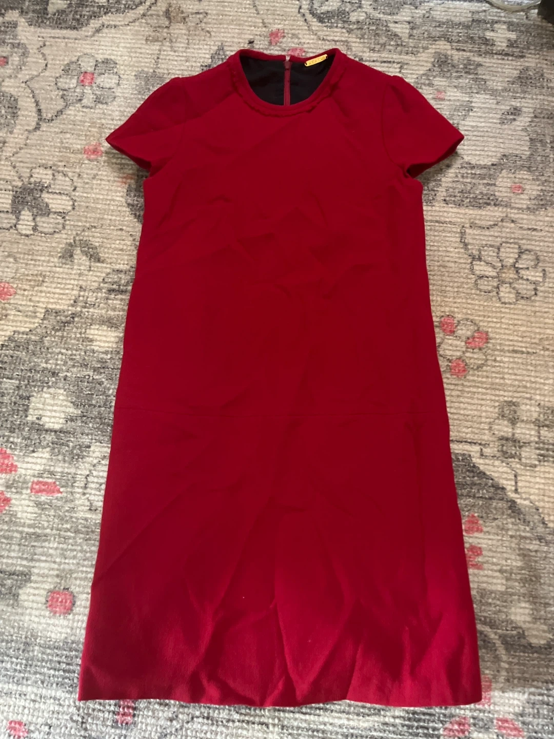 Alice + Olivia short sleeve sheath dress in red. Features a zip back closure and raw edge detailing at the neckline. Sheath silhouette.