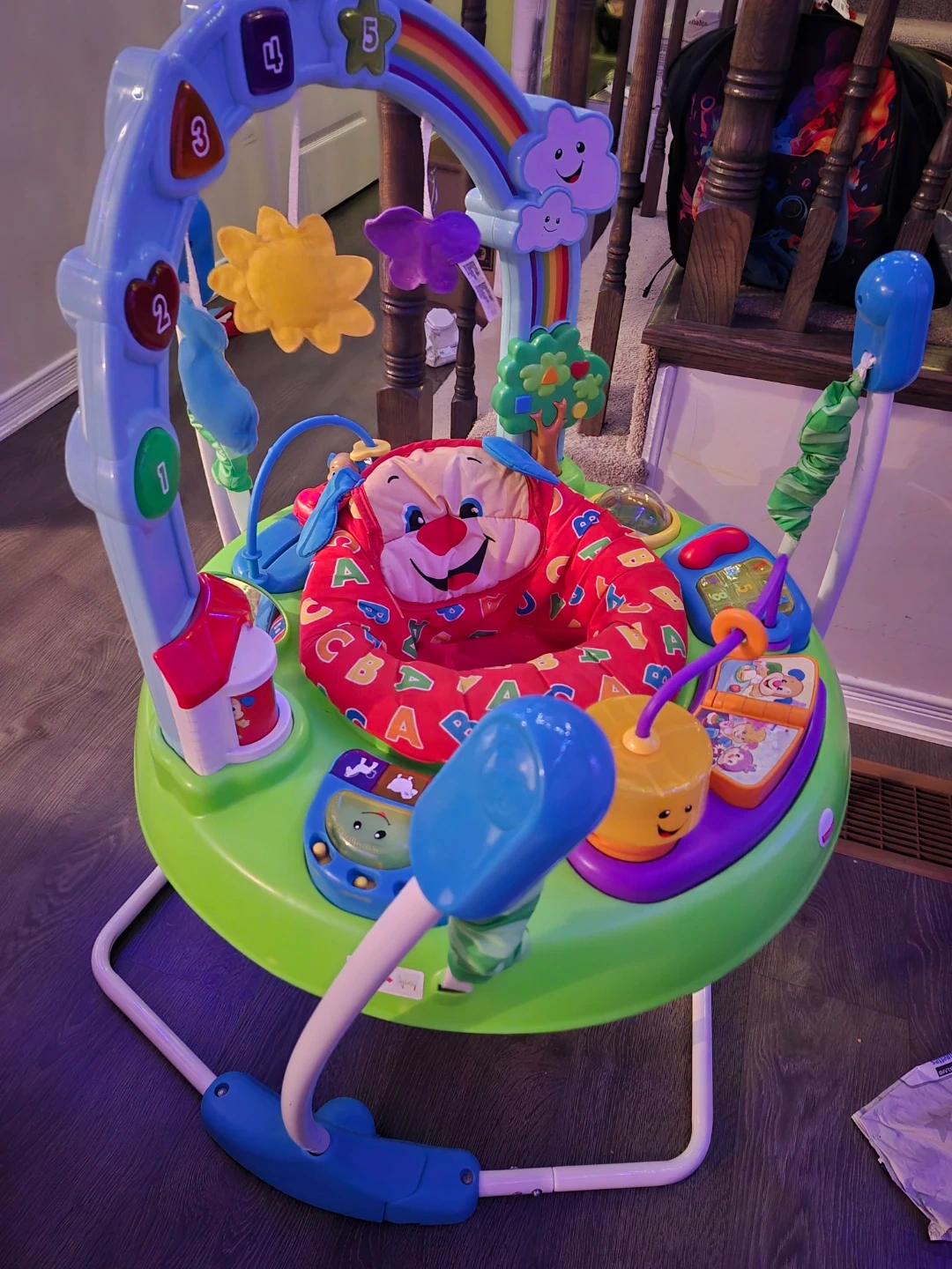 A colourful Fisher-Price jumperoo for babies. It's loaded with engaging activities and toys. Suitable for infants who can hold their heads up. It offers fun bouncing action!