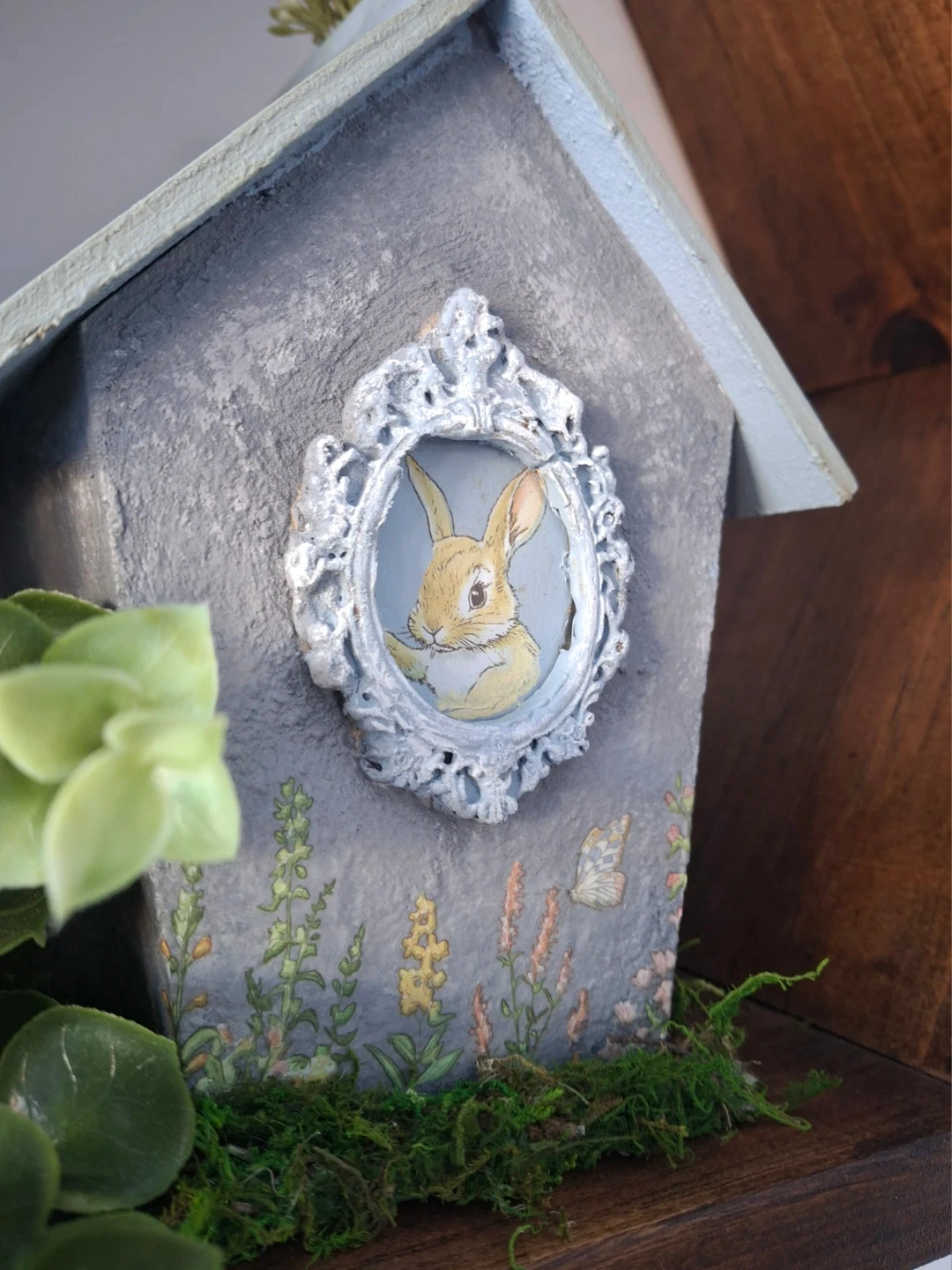 This charming pair of decorative birdhouses feature sweet Peter Cottontail portraits in ornate frames. Adorned with pretty floral and butterfly decals. A touch of moss adds a natural, rustic feel.