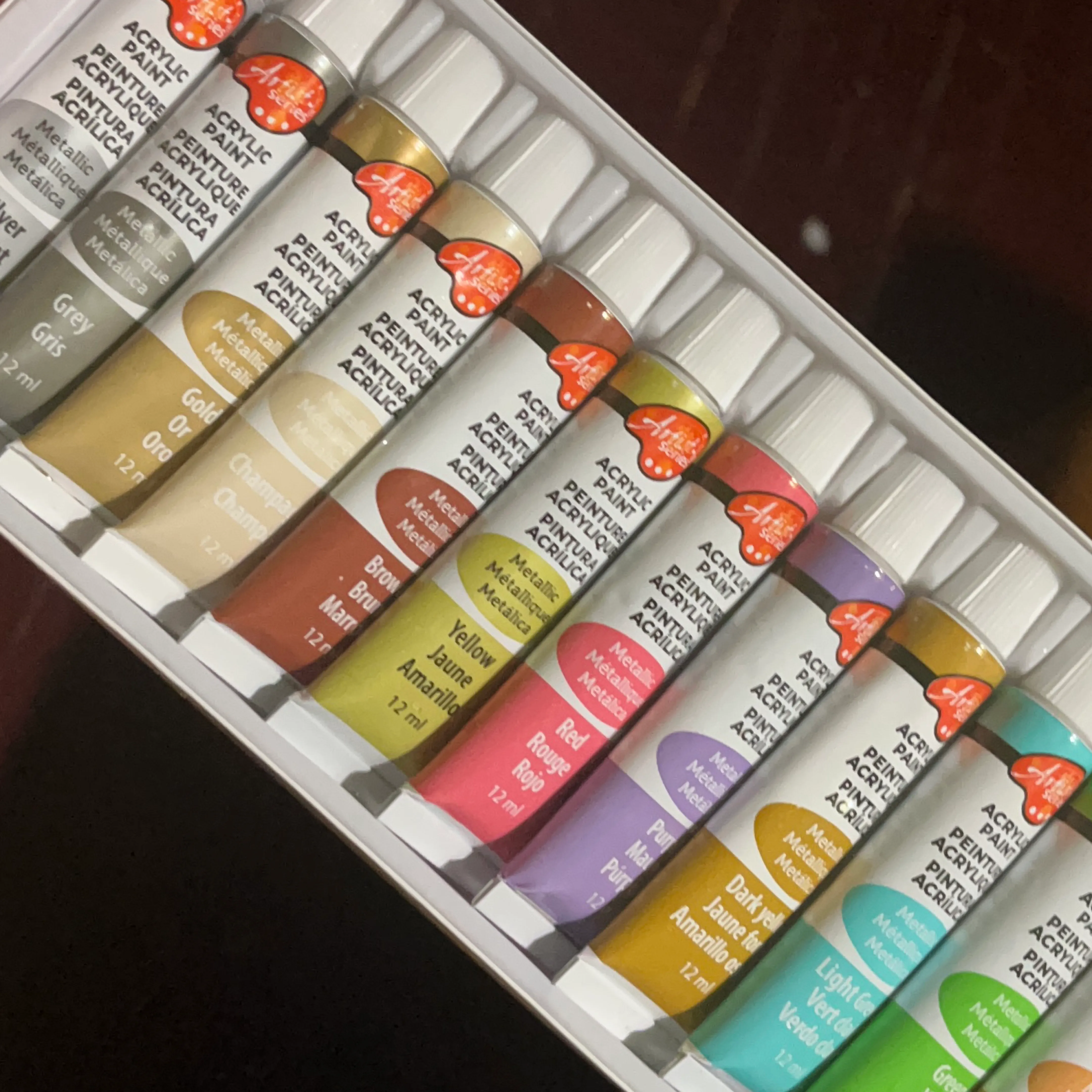 Set of twelve 12ml tubes metallic acrylic paint. Colours include gold, silver, grey, brown, red, yellow, purple, and green.