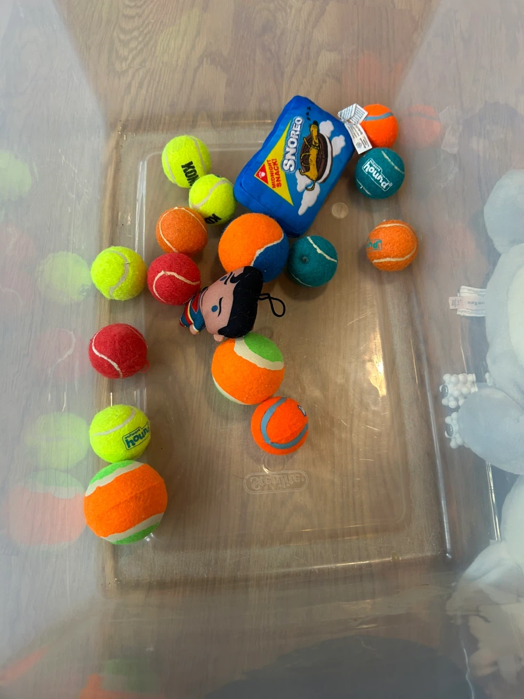 Bundle of dog toys, including several tennis balls and a plush 'Snoreo Midnight Snack' squeaky toy. Great for fetch and chewing! The tennis balls are durable and suitable for play. It's a fun assortment for any pup.