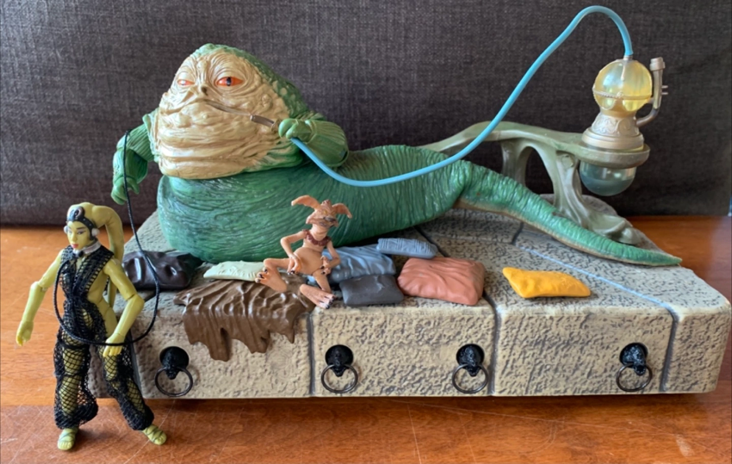 Star Wars Jabba's Palace action figure set.It includes Jabba the Hutt, Oola, and Salacious Crumb figures, along with other accessories. Great for any Star Wars fan.