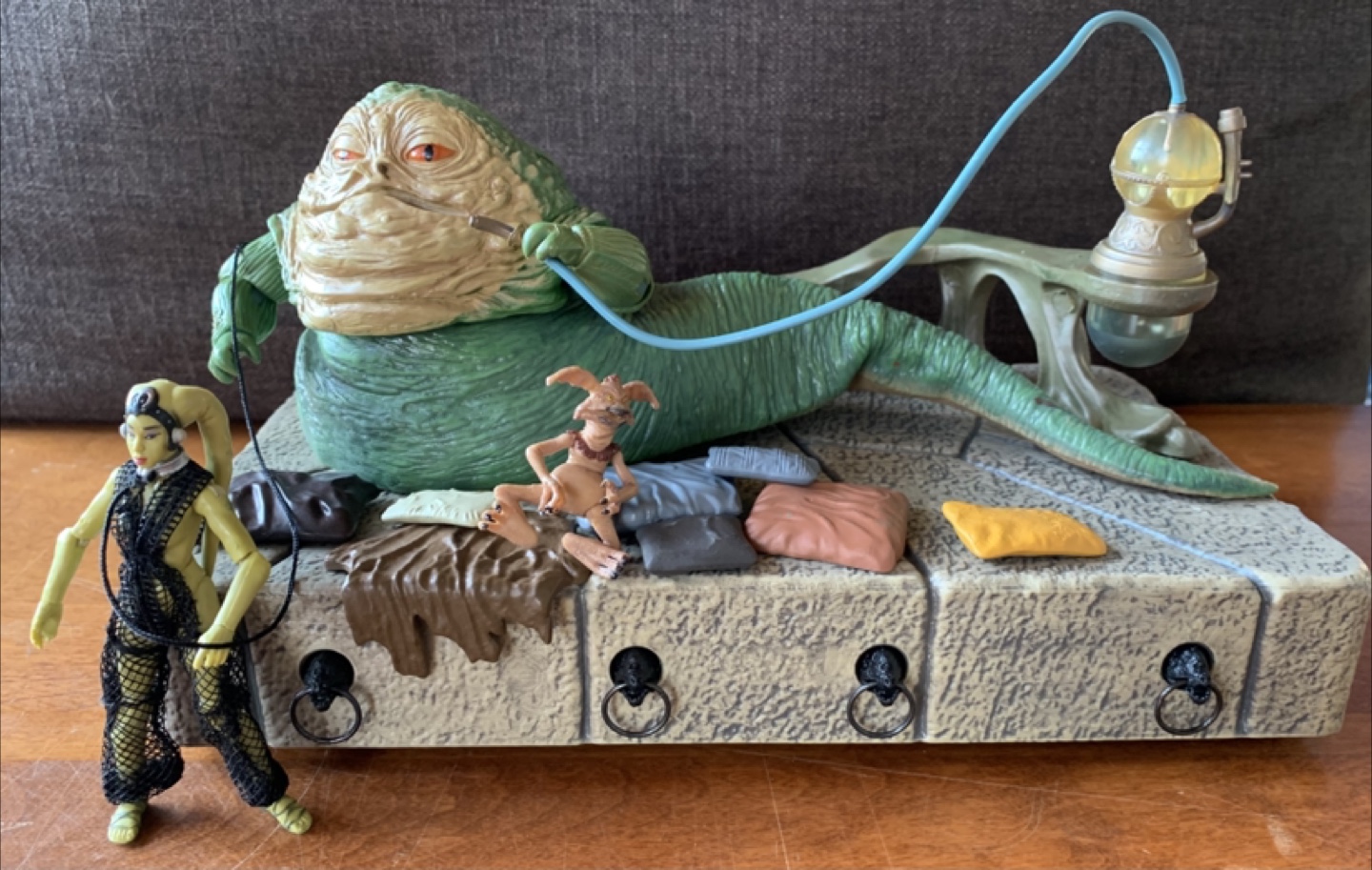Star Wars Jabba's Palace action figure set.It includes Jabba the Hutt, Oola, and Salacious Crumb figures, along with other accessories. Great for any Star Wars fan.