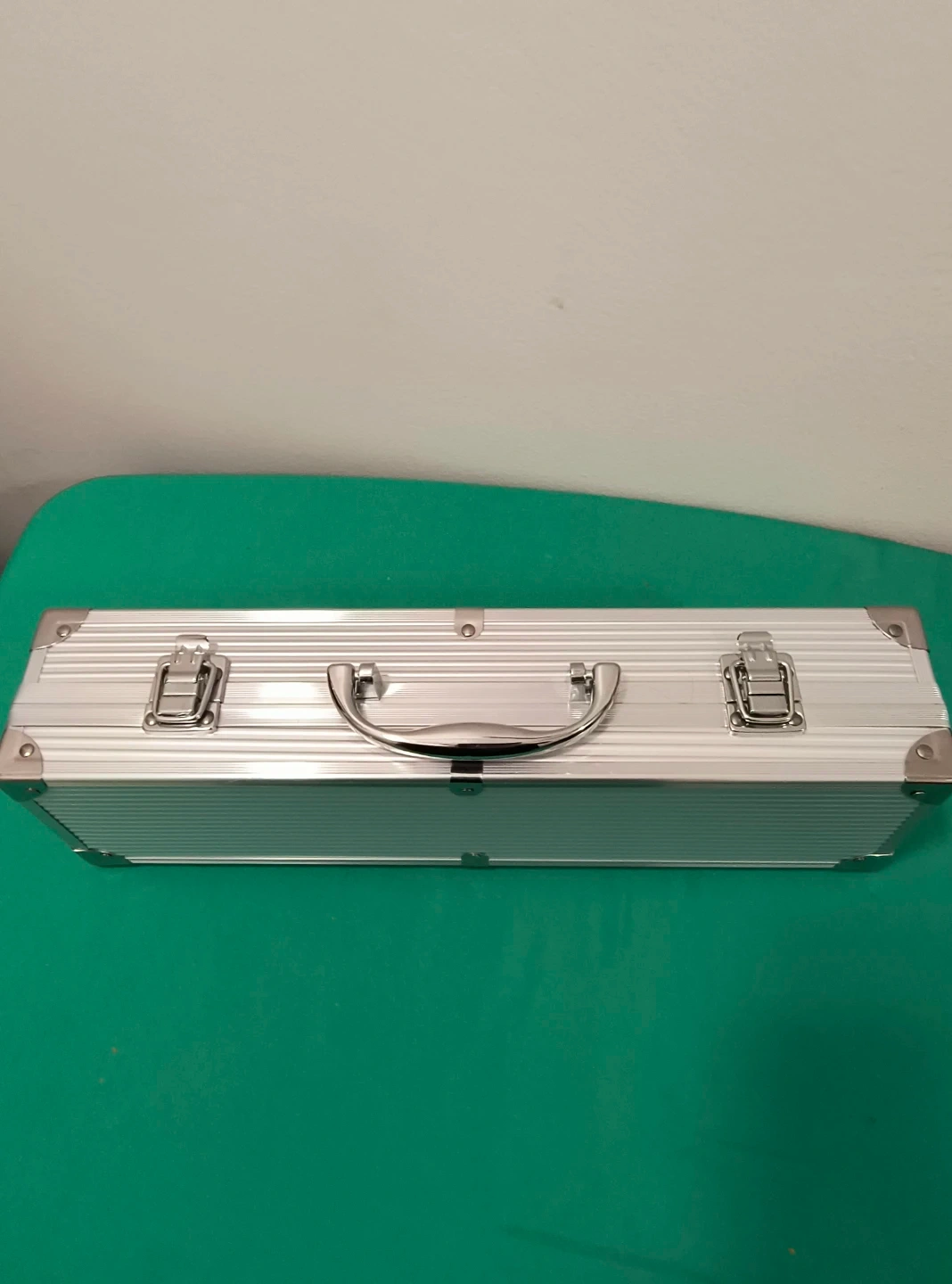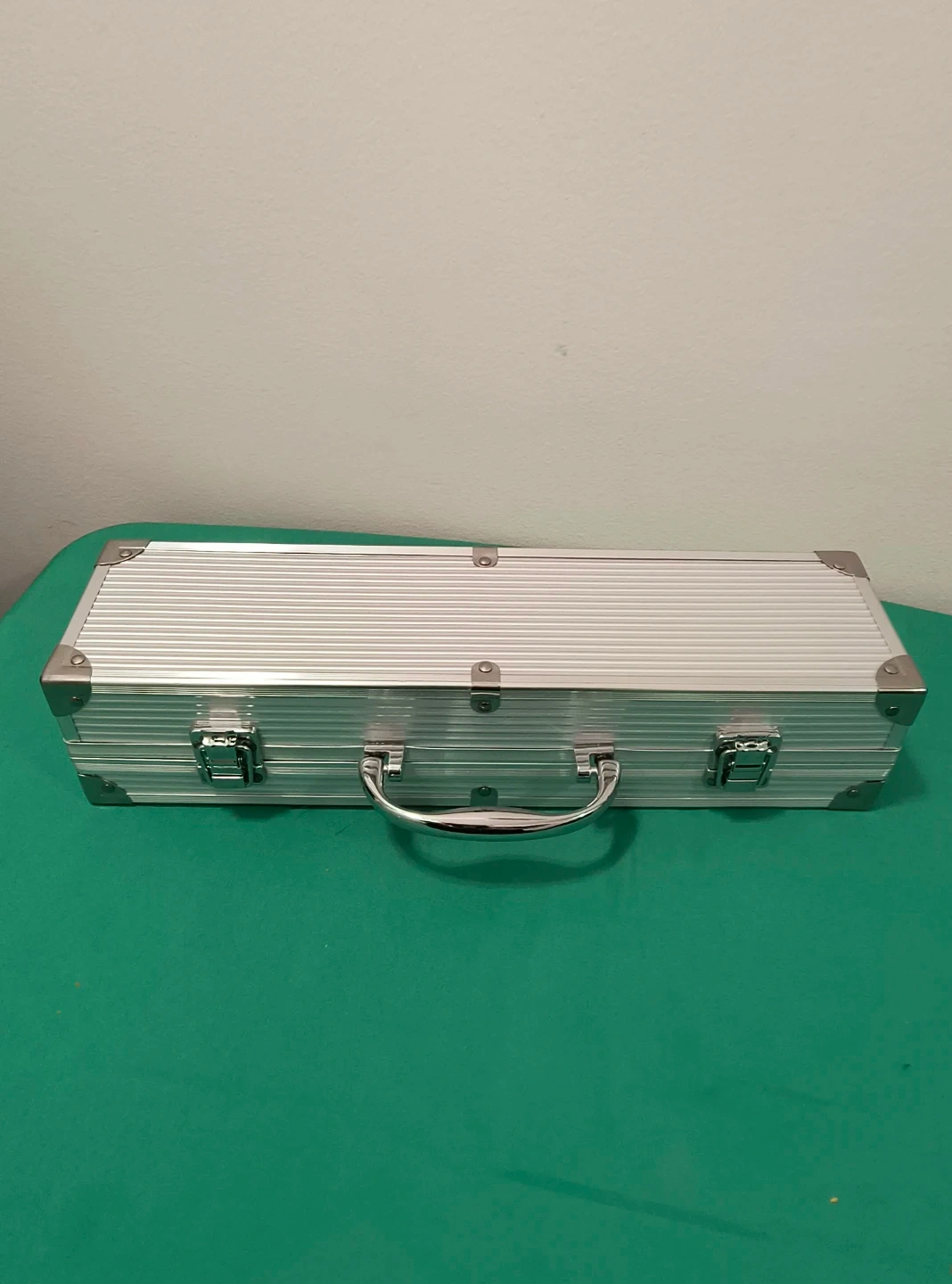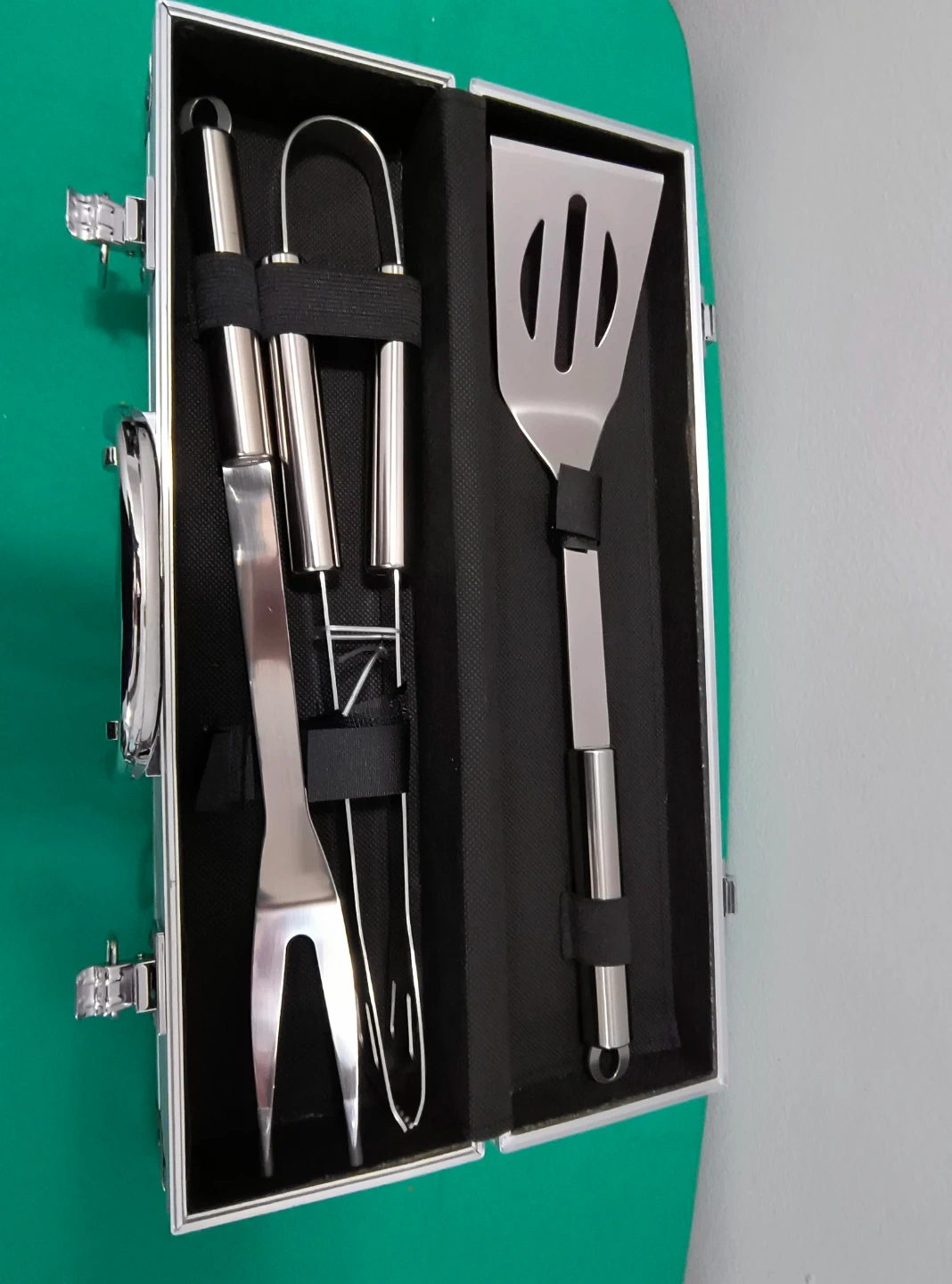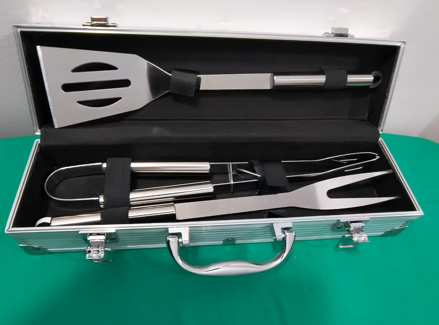 A four-piece barbecue tool set featuring a spatula, tongs, fork, and knife. It comes in a sturdy aluminum case with secure latches. This set is great for grilling enthusiasts!