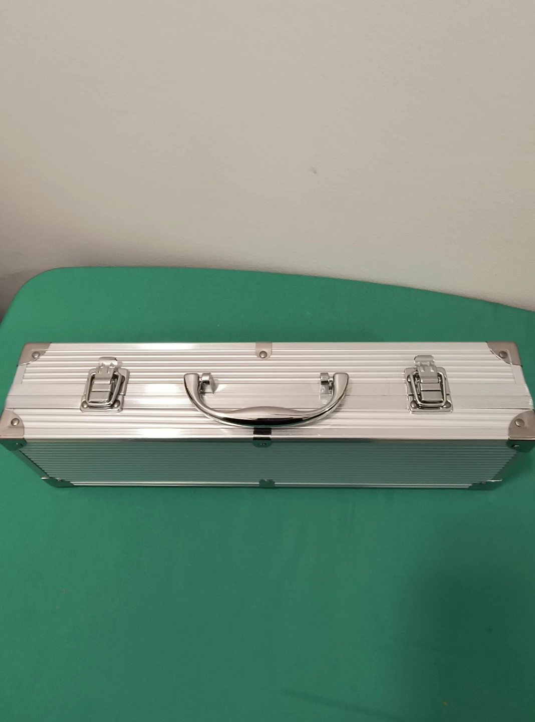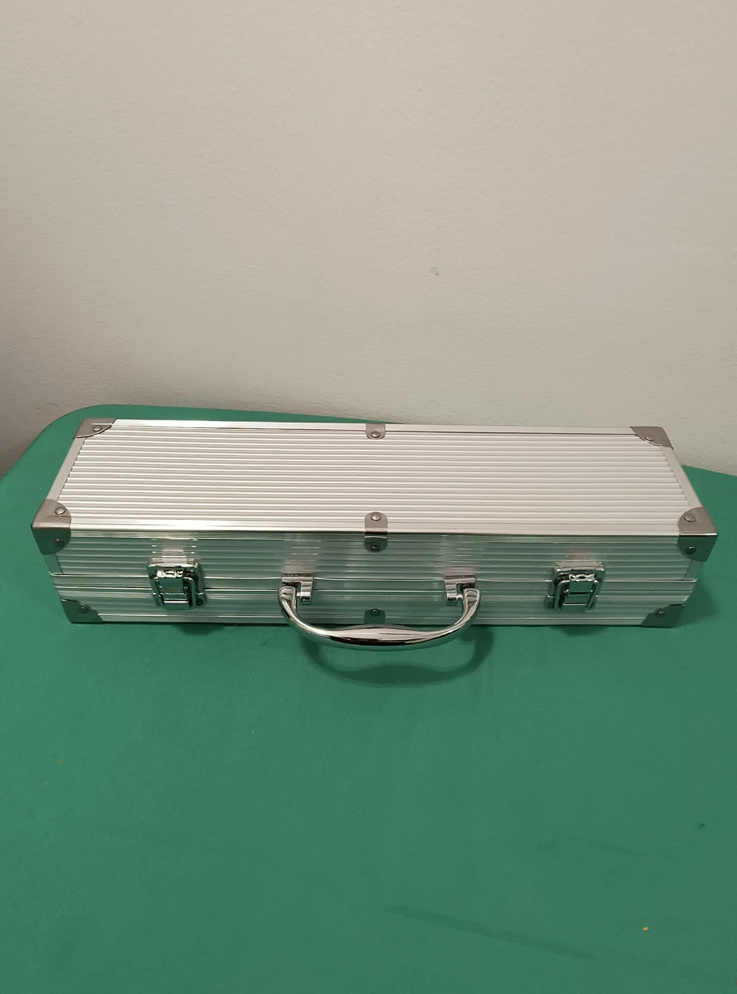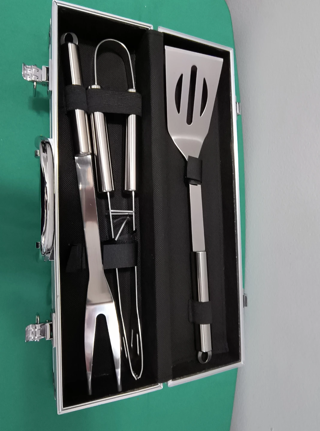 A four-piece barbecue tool set featuring a spatula, tongs, fork, and knife. It comes in a sturdy aluminum case with secure latches. This set is great for grilling enthusiasts!