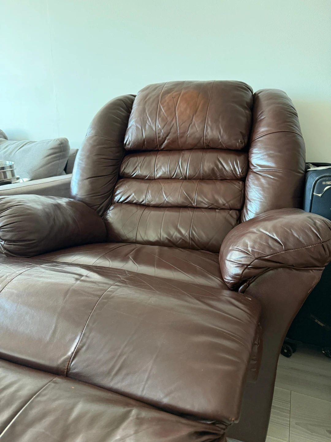 Comfortable brown leather recliner chair. It's a plush design with a padded headrest and armrests. This chair offers a relaxing recline for your living room. The backseat goes all the way flat as well.