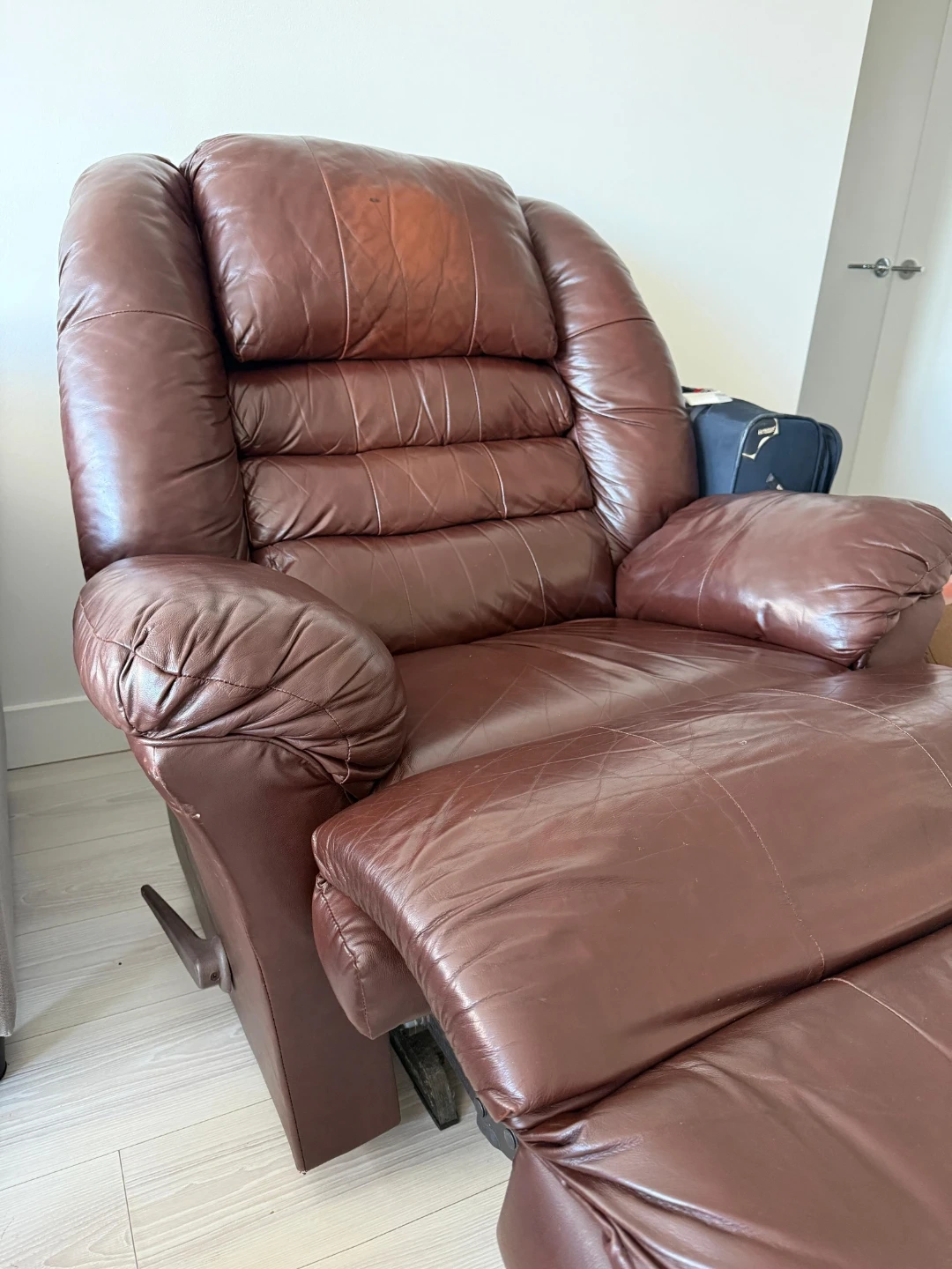 Comfortable brown leather recliner chair. It's a plush design with a padded headrest and armrests. This chair offers a relaxing recline for your living room. The backseat goes all the way flat as well.