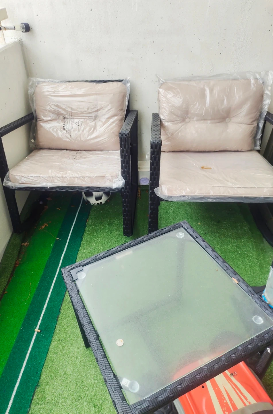 Two wicker patio chairs with beige cushions and a glass top coffee table. Cushions are still in original plastic wrapping. Perfect for a small balcony or patio space! Great for relaxing outdoors.