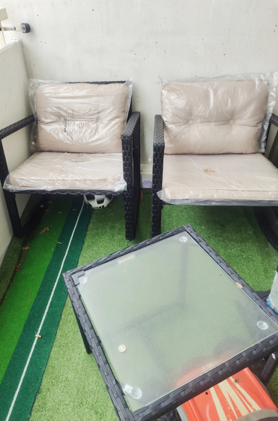 Two wicker patio chairs with beige cushions and a glass top coffee table. Cushions are still in original plastic wrapping. Perfect for a small balcony or patio space! Great for relaxing outdoors.