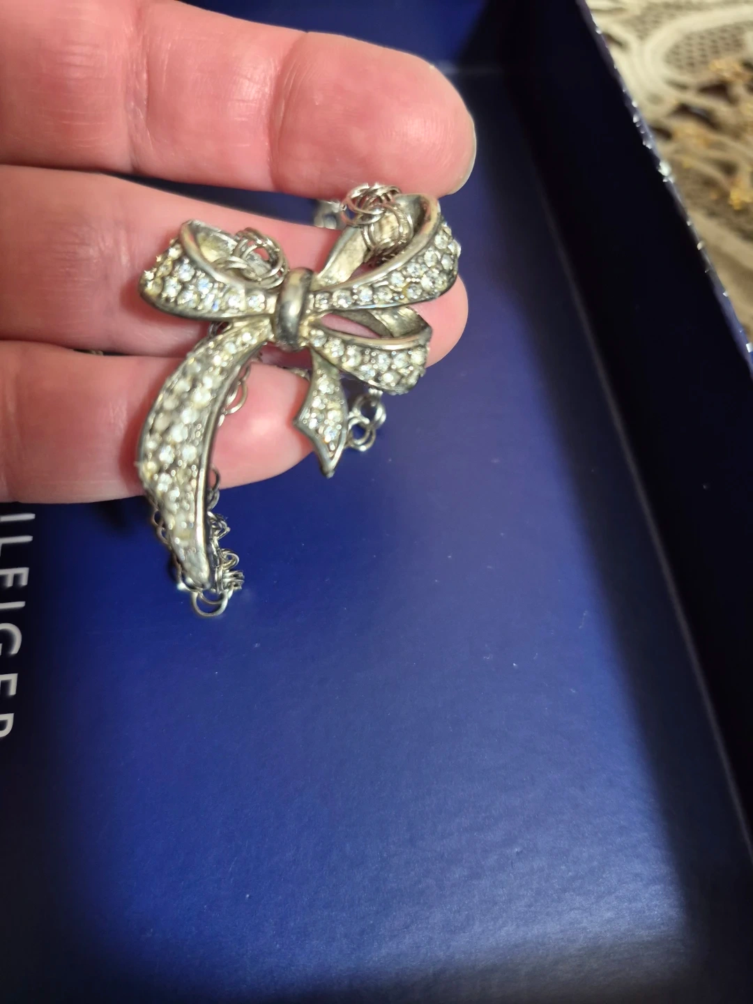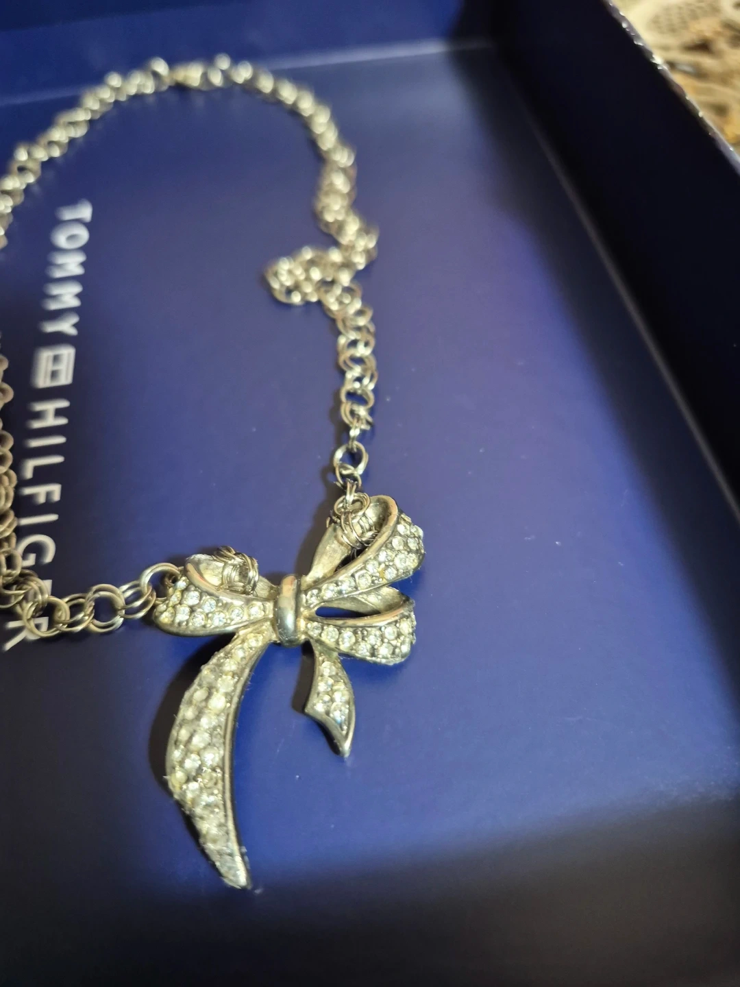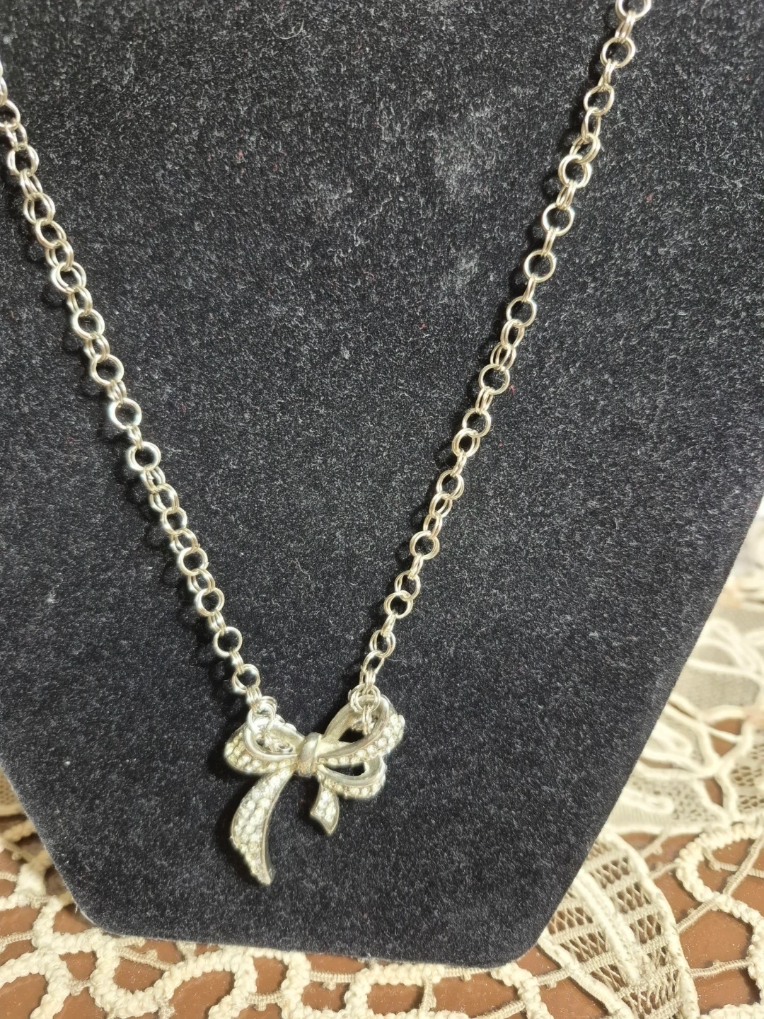 A charming silver-tone necklace featuring a sparkling bow pendant. It's perfect for adding a touch of elegance to any outfit. The chain is silver-tone and the pendant is encrusted with clear rhinestones.