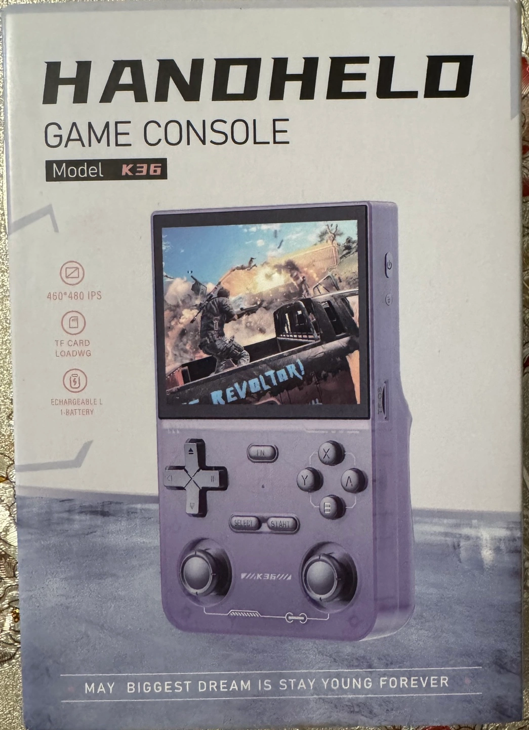 Selling a brand new sealed handheld game console, model K36. It features a 450x480 IPS screen and supports TF card loading. It comes with a rechargeable battery.