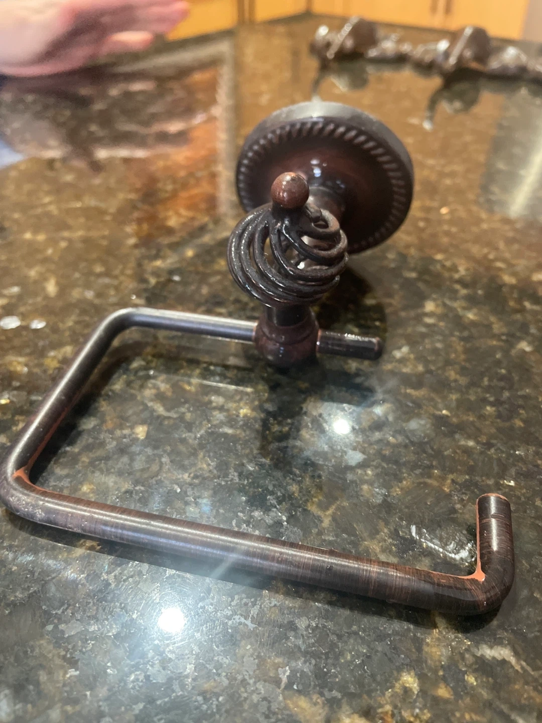 This toilet paper holder features a dark, oil-rubbed bronze finish with a decorative scrolled finial. It's designed for easy roll replacement. A nice touch for any bathroom!