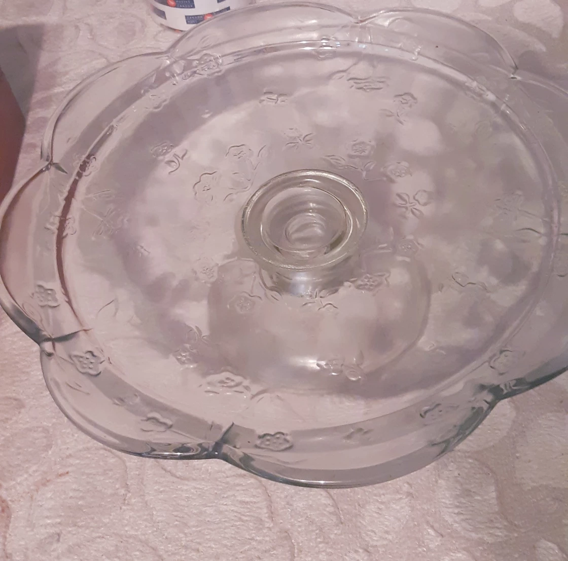Selling a lovely glass cake stand! It has a pretty floral design etched into the glass. Perfect for displaying your baked goods or desserts at your next get-together. It's in great condition and ready for a new home