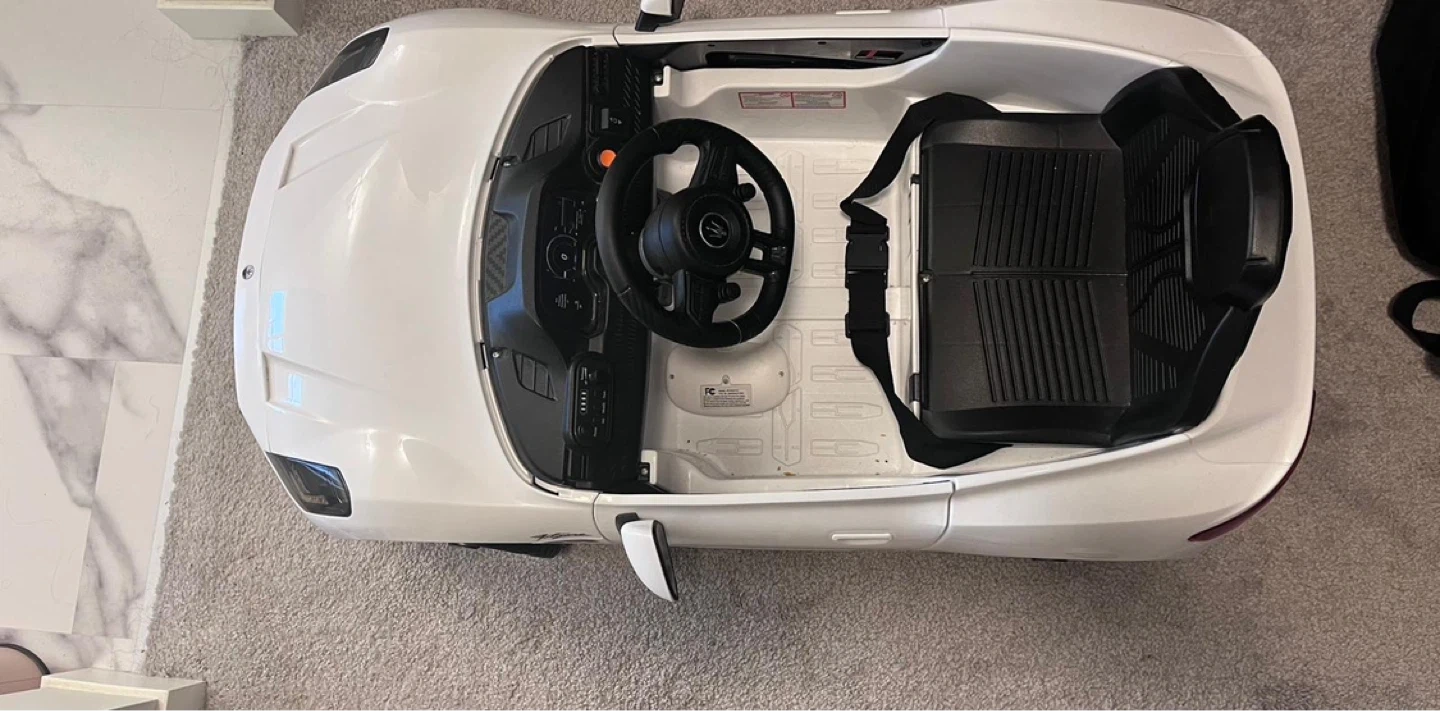 This is a white Maserati GranTurismo ride-on toy car, perfect for little drivers. It features realistic styling, a steering wheel, and a seat. It's powered by a rechargeable battery for hours of fun!