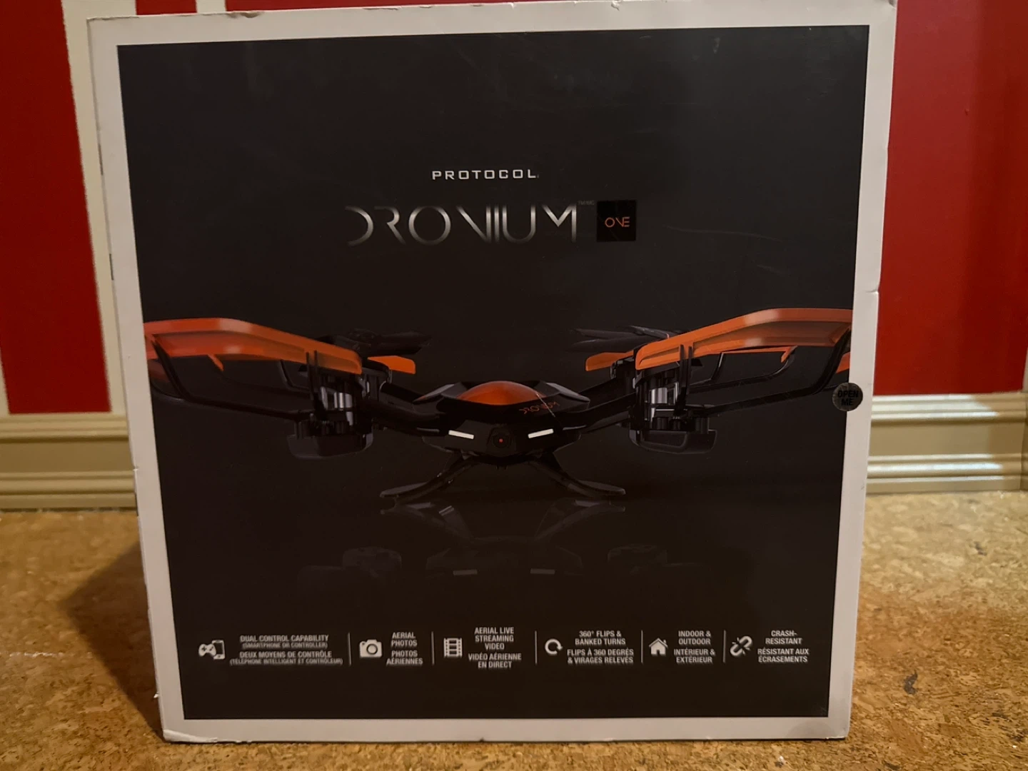 This is the Protocol Dronium One drone, featuring live streaming capabilities and aerial photography. Control using the included controller or via wifi on your phone. It's built with crash-resistant construction. Includes remote control, phone mount, USB cable, spare blades, and guards.