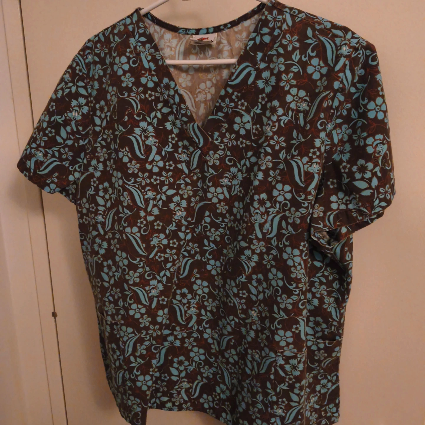 This is a scrub top with a brown base and a blue floral pattern. It's a V-neck style with short sleeves and two pockets at the bottom. It's comfortable for a long shift!
