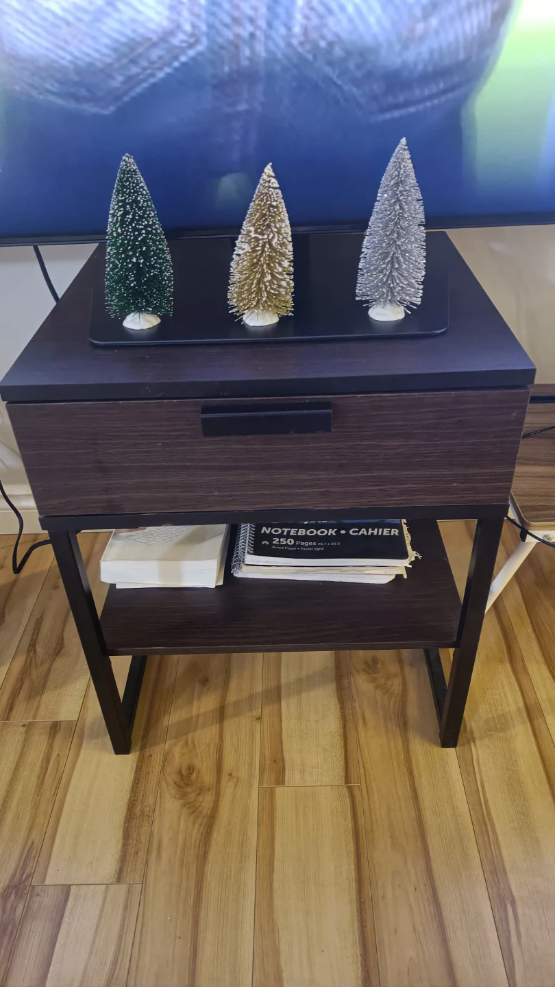 This dark wood accent table features a convenient drawer for storage and an open shelf below. It's a handy spot to place remotes, books, or decorative items. The compact size makes it suitable for small spaces.
