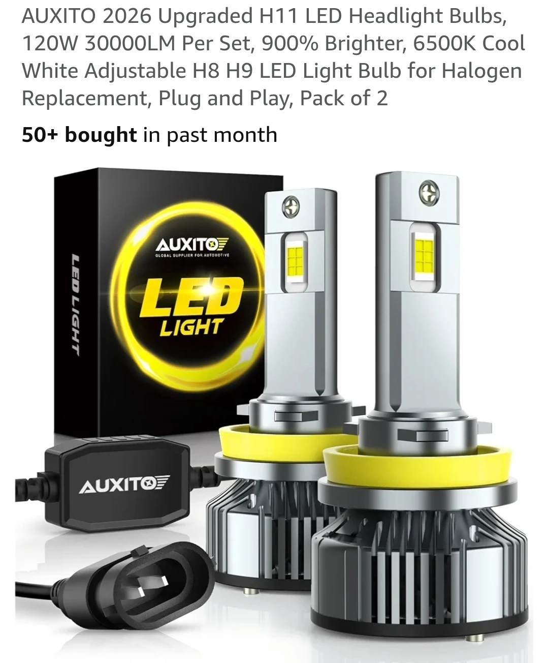 Selling a brand new set of AUXITO 2026 upgraded H11 LED headlight bulbs. These are 120W 30000LM per set, 900% brighter, and 6500K cool white. They're H8 H9 LED light bulbs designed for halogen replacement, plug and play, and come in a pack of 2!