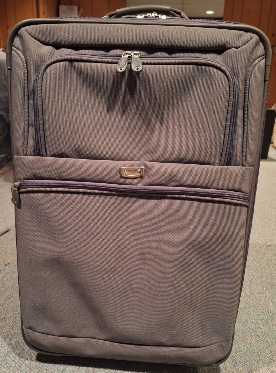 Full size two wheel expandable suitcase with a pull up handle. Two exterior zipped compartments. One Interior zipped compartment and two interior pockets.