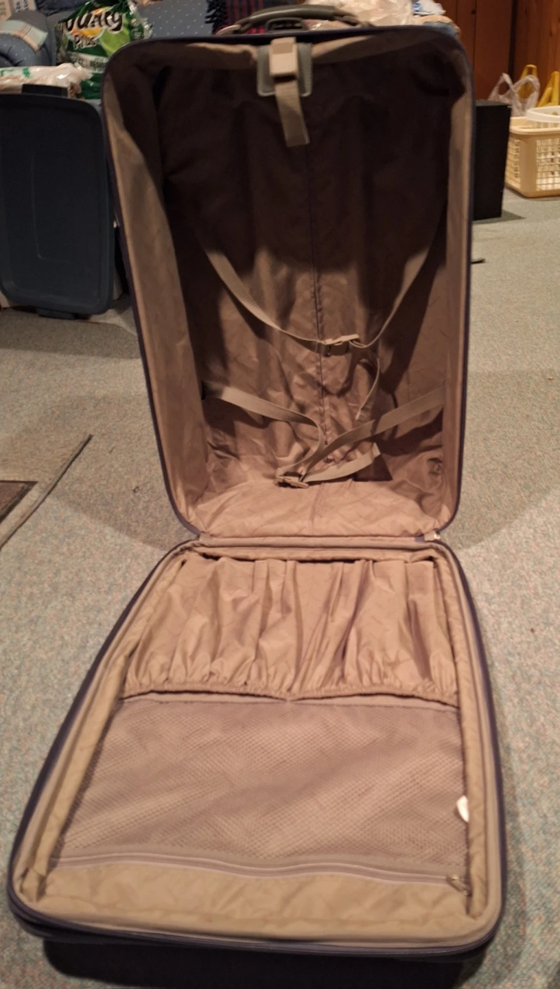 Full size two wheel expandable suitcase with a pull up handle. Two exterior zipped compartments. One Interior zipped compartment and two interior pockets.
