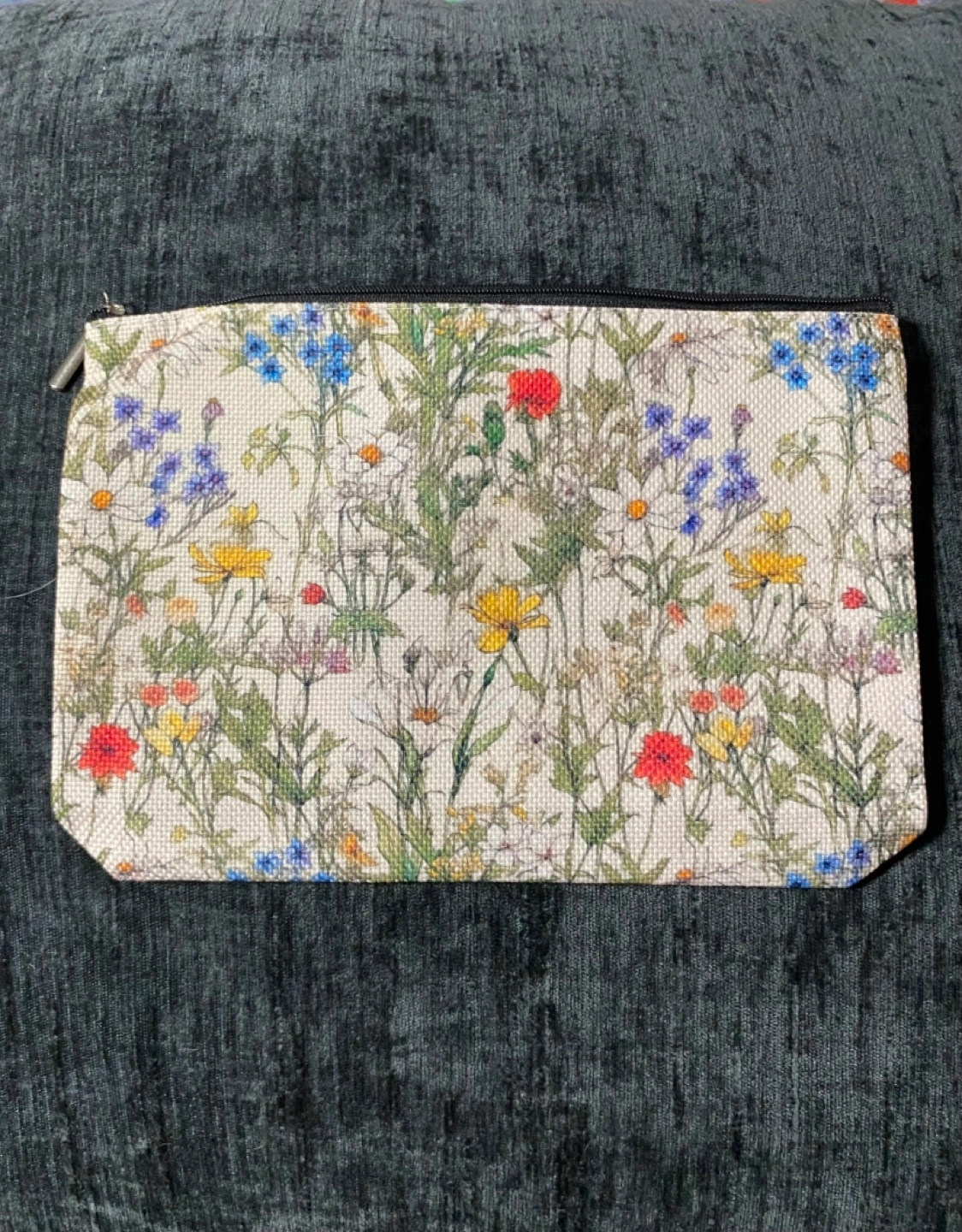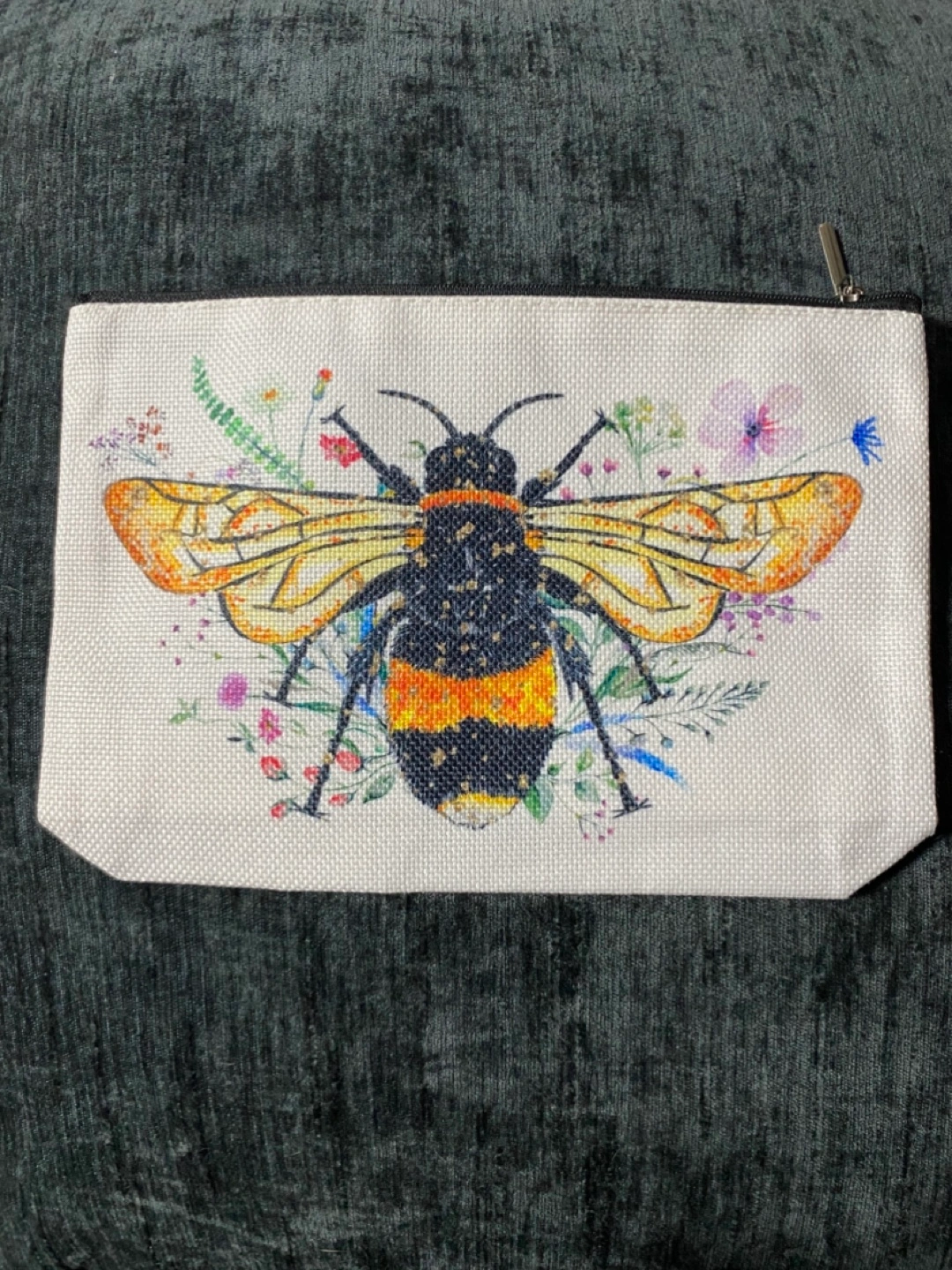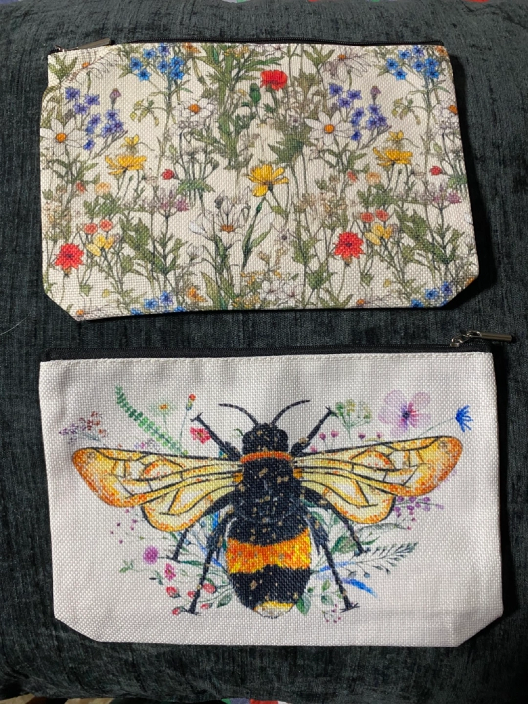 Set of two, new zippered pouches. One features a bumble bee surrounded by flowers. The other is a pretty floral print. Perfect for toiletries or make-up. 10 x 7 x 2”. Pick up only, closest intersection is Wilson and Rossland.