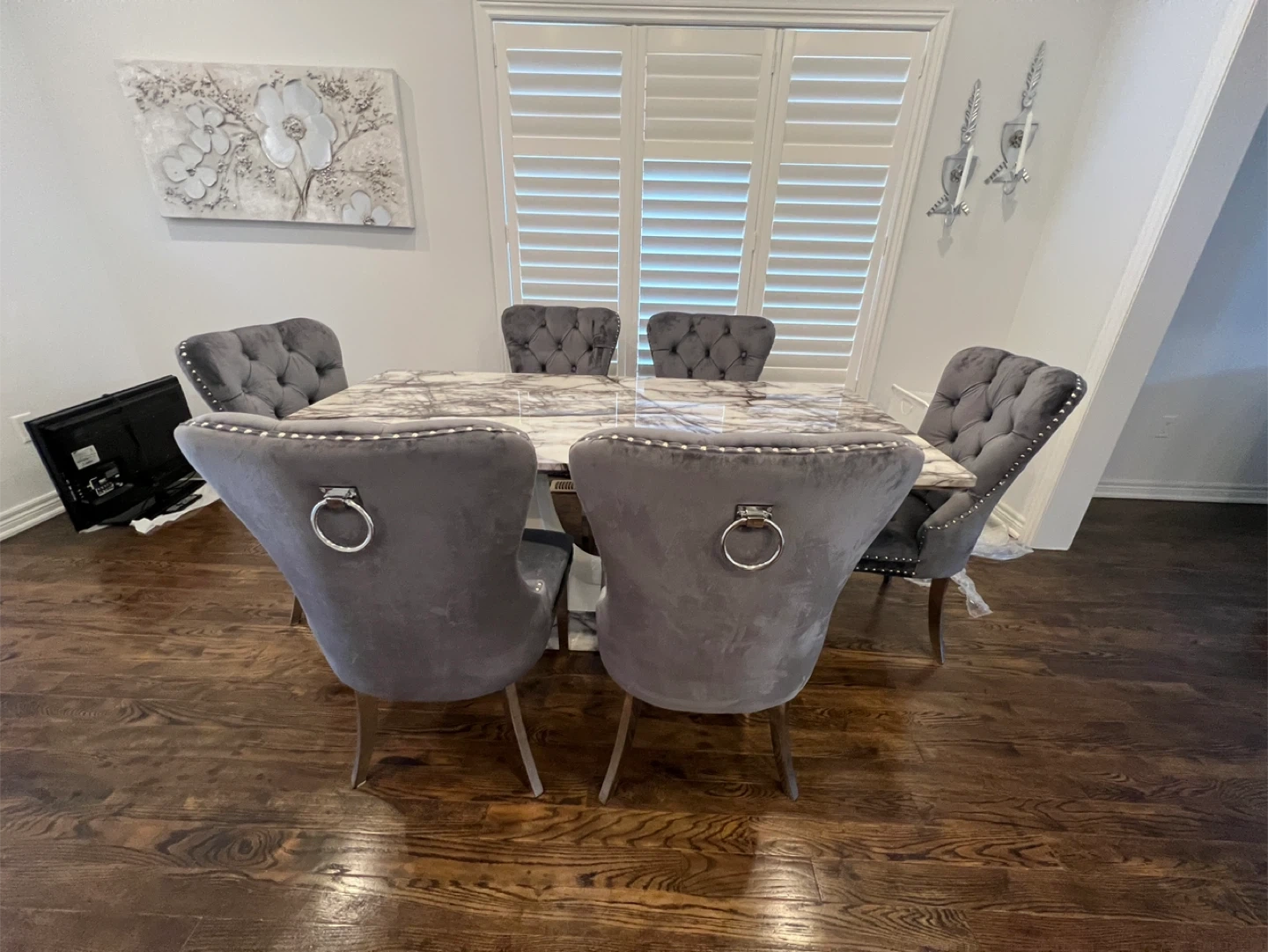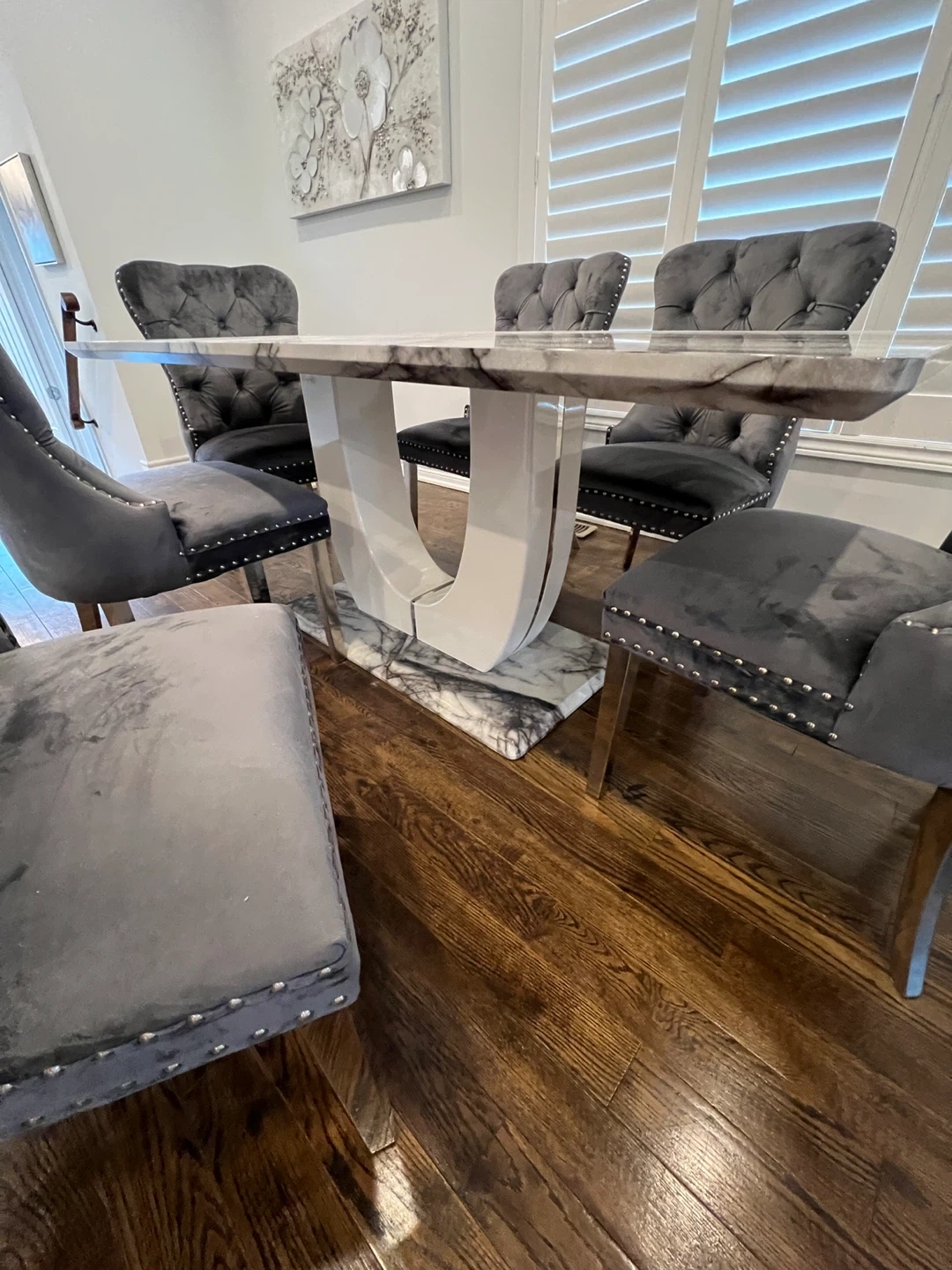 Moving Sale--Marble Dining Table and 6 Grey Velvet Chairs