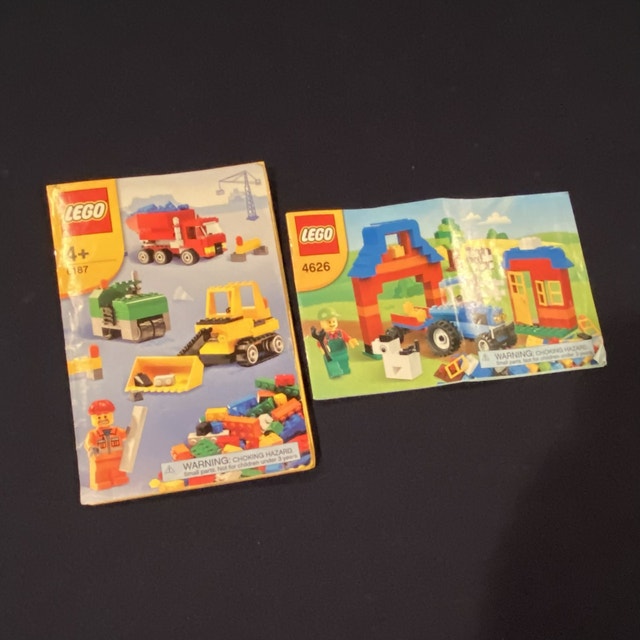 A collection of Lego for kids 4 and up. Includes storage boxes, a green base plate, and instruction booklets. Over 500 pieces in total. Includes set 6187 (Road Construction) and set 4626 (Brick Box). No missing pieces! Available for pickup in Pickering near Finch & Whites. Cash accepted.