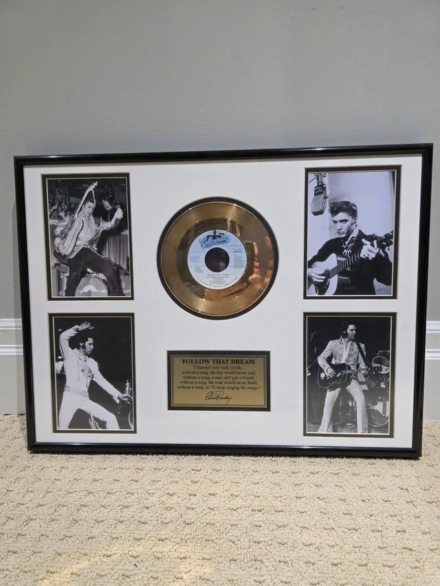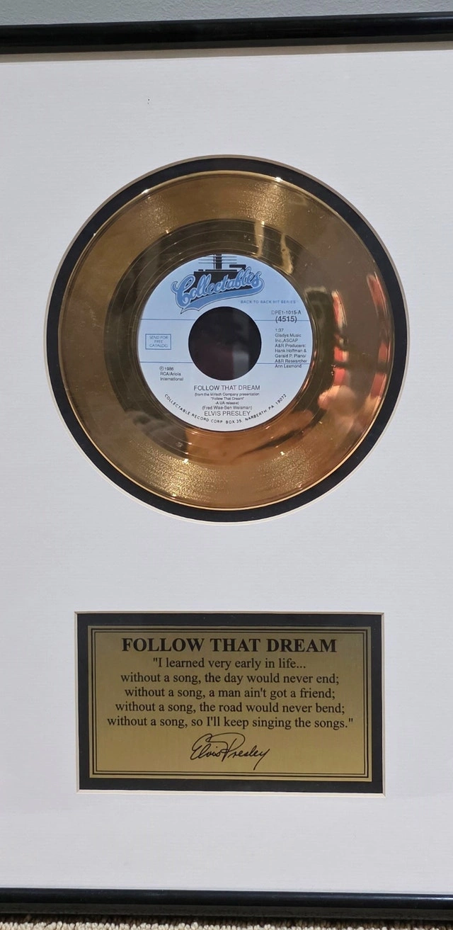 Elvis Presley Follow That Dream 24kt gold plated record with Certificate of Authenticity. Measures 18.5"H x 24.5"W. Purchased at Graceland. Condition: New. Pop Culture Collectibles. Cash accepted.