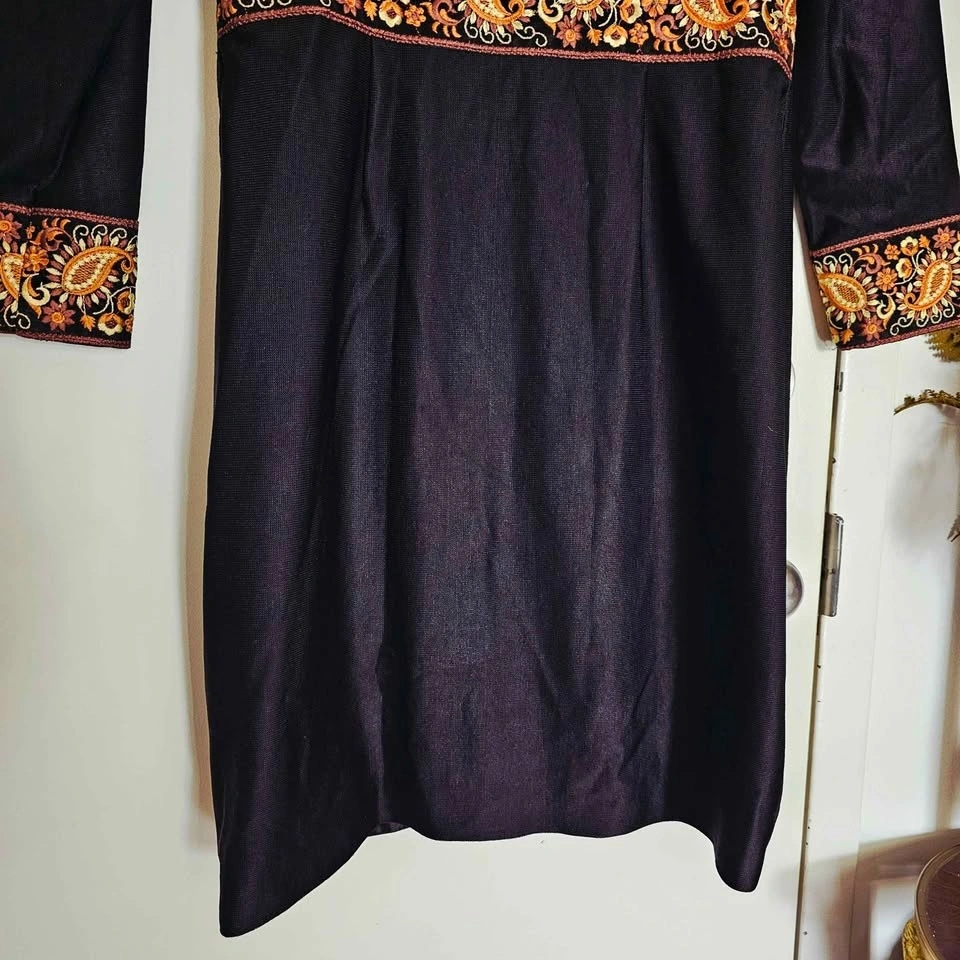 It features bold and intricate embroidery in an earth tone pallette of terracotta, brown, and cream that creates a tapestry effect against a crisp black backdrop. Embroidery features traditional Kashmiri-inspired motifs, specifically the paisley (Kalka) and floral vines.