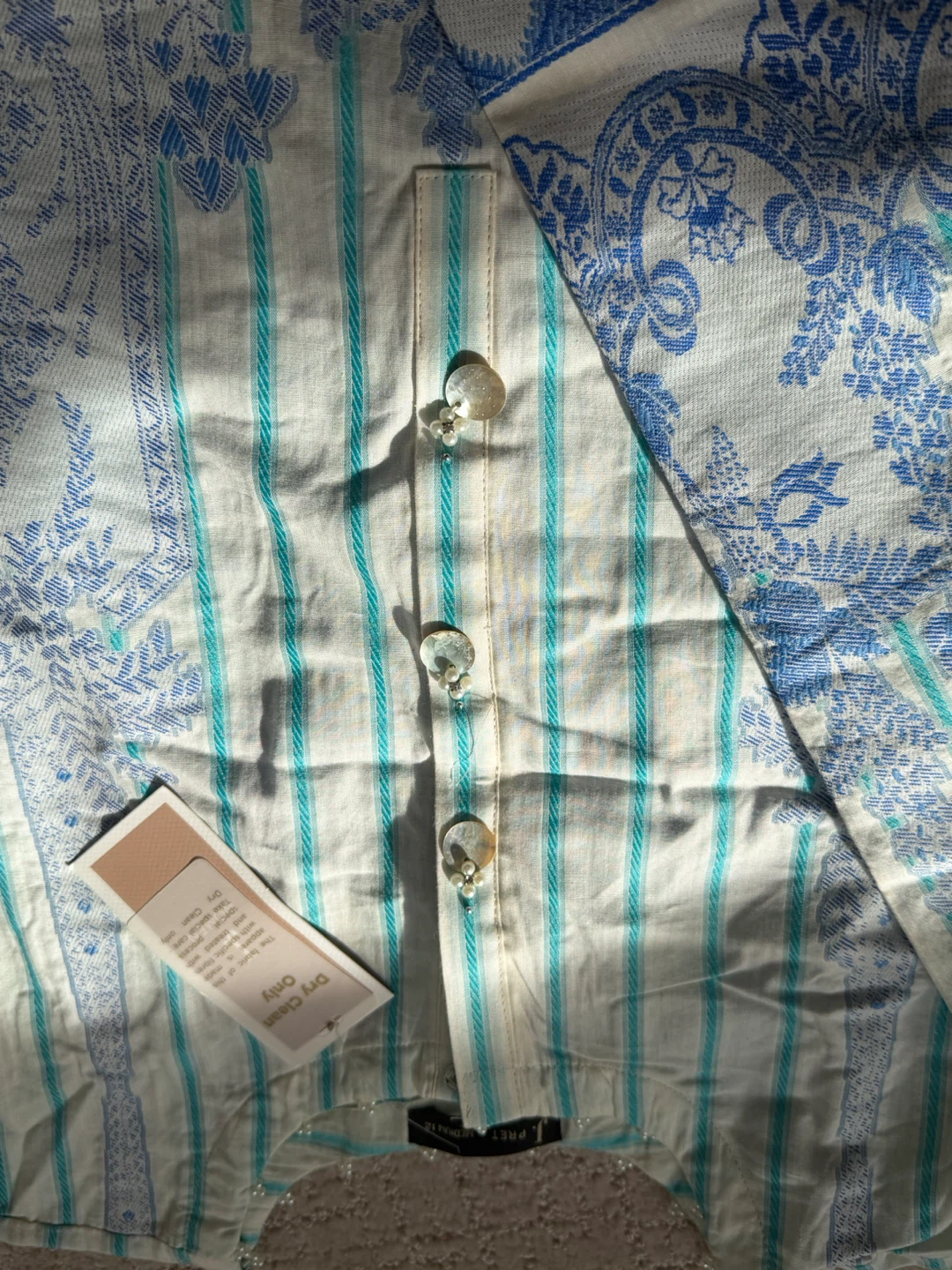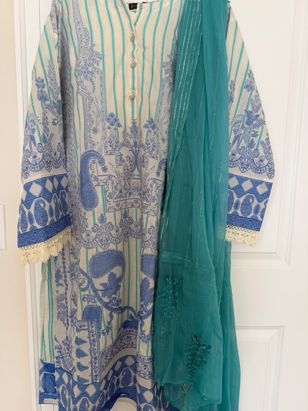 Three-piece J. suite featuring a blue and white striped kurti with intricate paisley and floral prints. It's accented with pearl-like buttons and lace trim on the sleeves. Comes with a teal chiffon dupatta and cream trousers. Dry clean only.