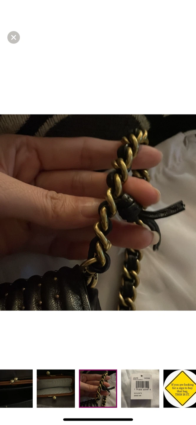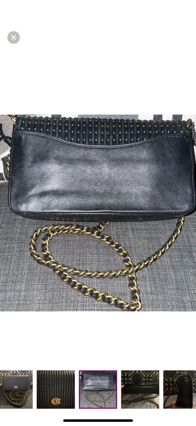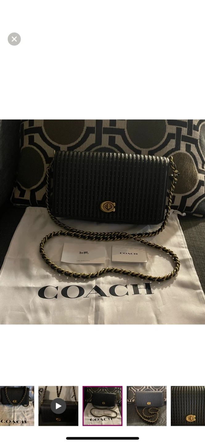 Selling a stylish black leather Coach bag. It's in brand new condition and perfect for everyday use or a night out. The bag features a chain strap and a secure closure. It also comes with the original Coach dust bag and care instructions!