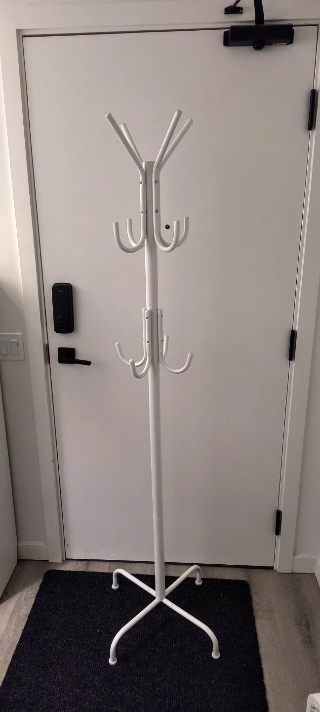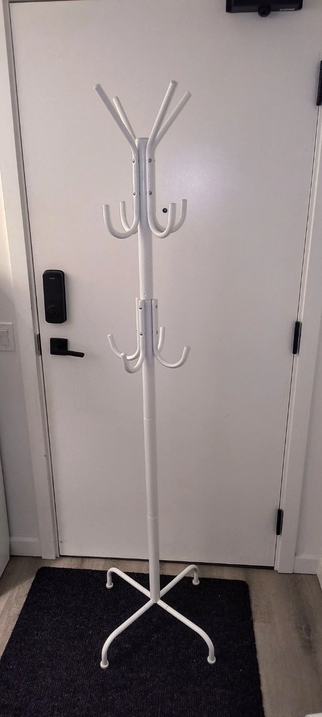 Selling a sturdy standing white metal coat rack! It's in great condition and perfect for keeping your coats, hats, and bags organized. A simple and functional addition to any entryway or closet.