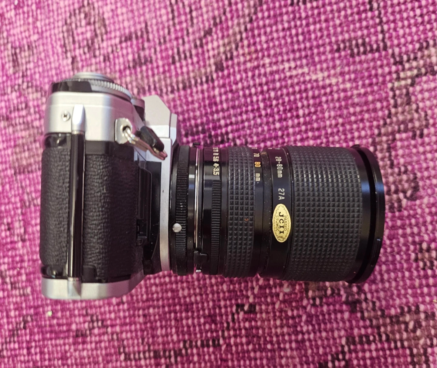 This is a vintage Canon AE-1 Program 35mm Single-Lens Reflex (SLR) film camera. It comes with a 28-80mm zoom lens. The camera body is silver and black with a textured grip. It includes a neck strap.