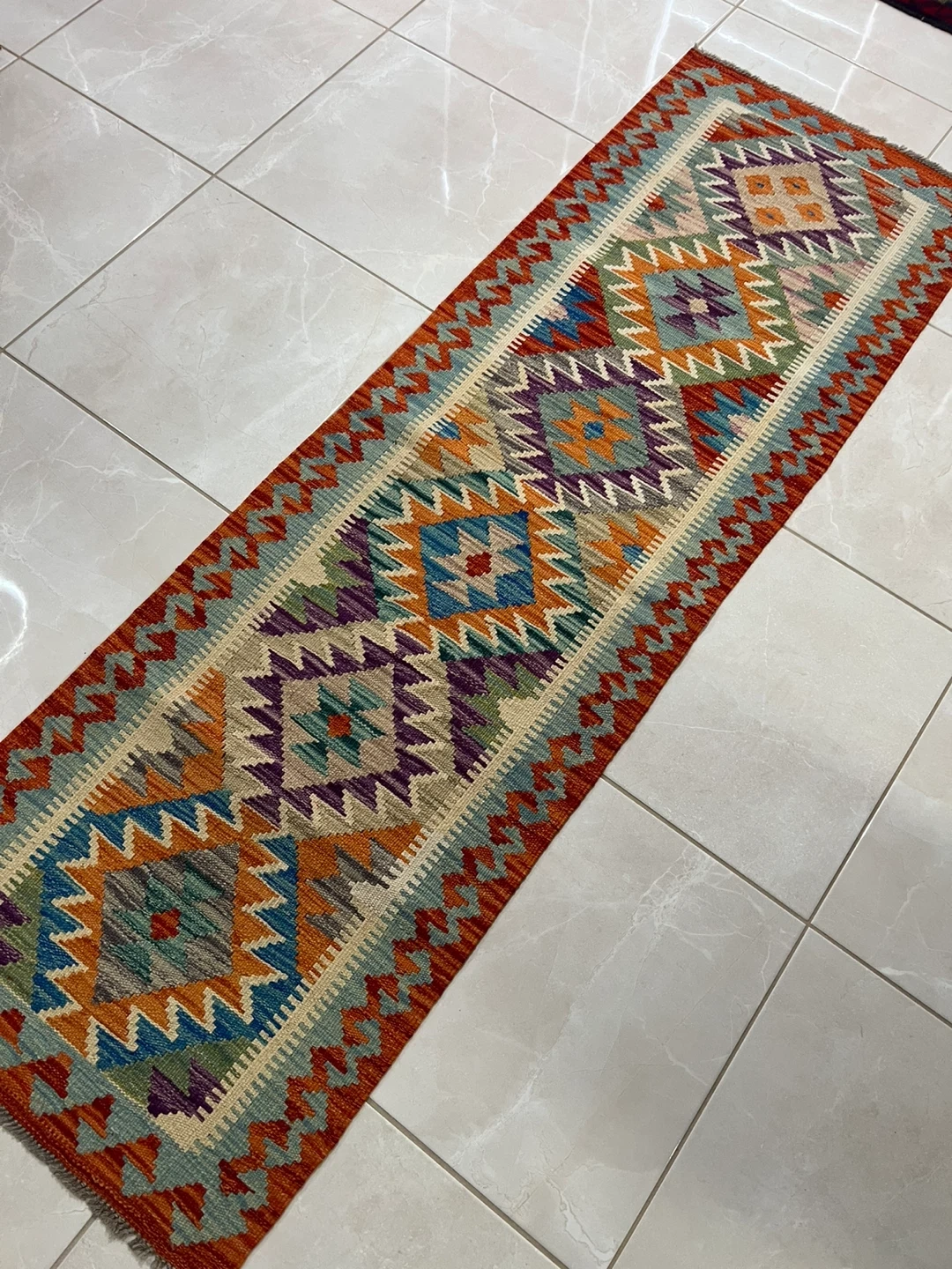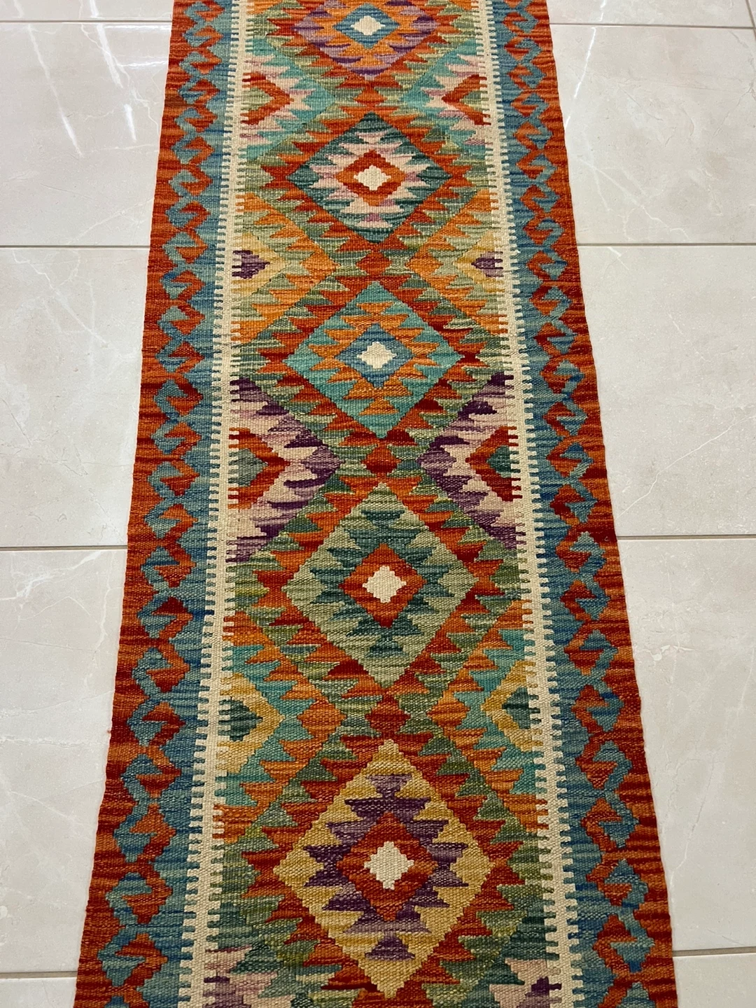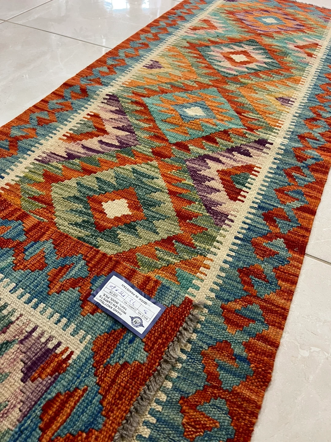 Three beautiful hand-knotted runner rug made from 100% wool. It features a vibrant geometric pattern with a variety of colours. It's perfect for adding a cozy touch to hallways or entryways. The rug measures 2*6 ft