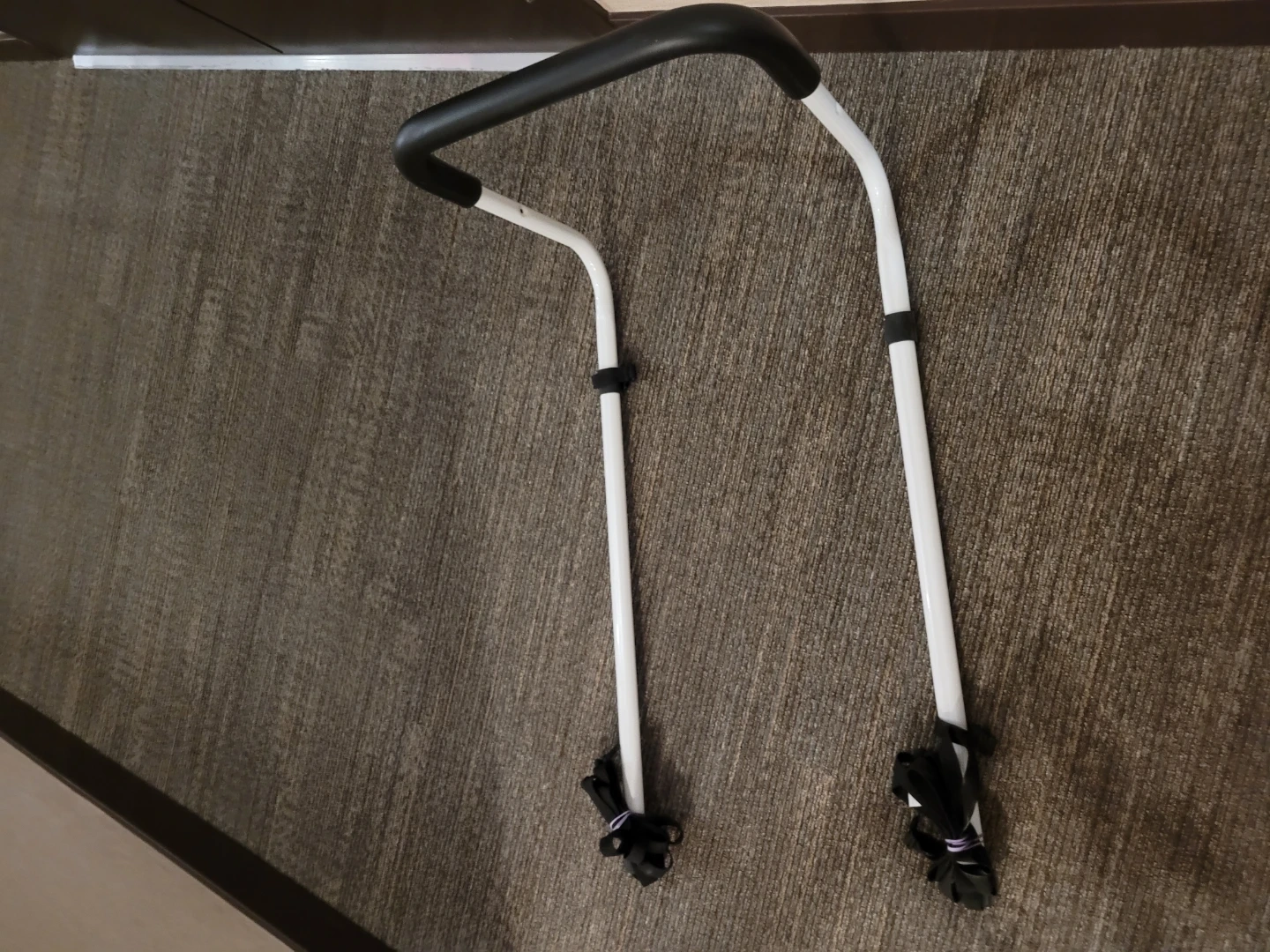 This is a bed rail assist handle. It's made of white metal tubing with a black rubberized grip. Straps are included for securing it to the bed frame. It's useful for providing extra support when getting in and out of bed.